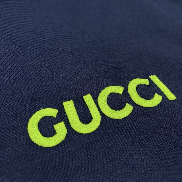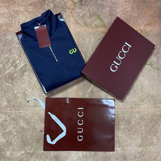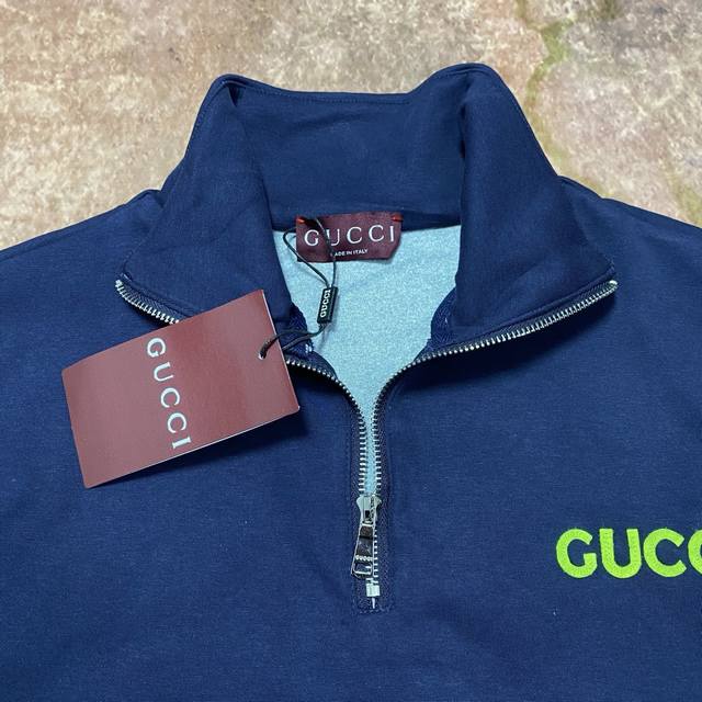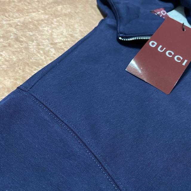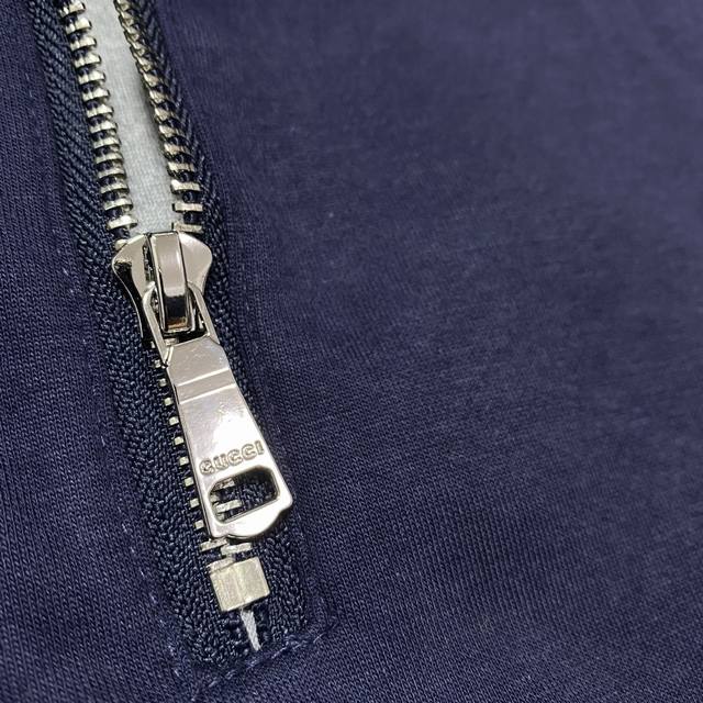 In Stock Gucci Embroidered Label Space Cotton Ddd Size SML XL DDD The fabric is made of 40-count double-sided air layer, thick and structured, yet lightweight and breathable against the skin. The wash weight is approximately 400 grams. The zipper features an electroplated bright white zipper pull, and the zipper teeth are electroplated with matching European-style brass teeth. The embroidery uses laser burning to create individual letters, followed by hand-applied label placement and precise embroidery to ensure the logo is firmly attached. Many new season knitwear items continue to showcase the brand's elements with meticulous craftsmanship. This half-zipper is crafted from viscose fiber knit fabric and subtly adorned with Gucci logo patches, showcasing its unique charm. DDD