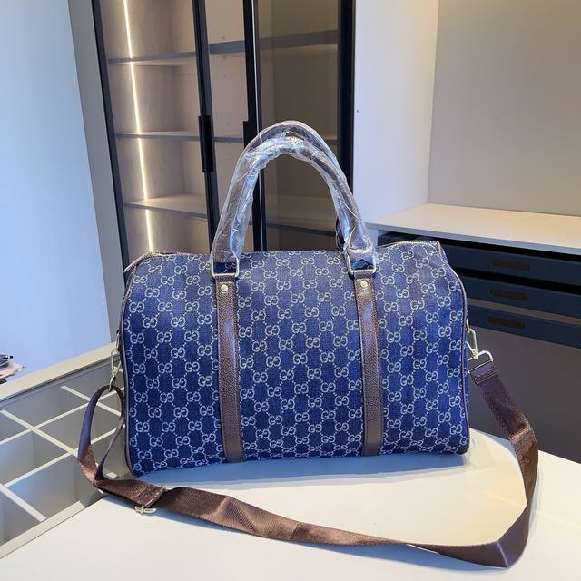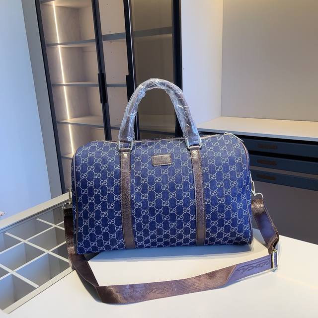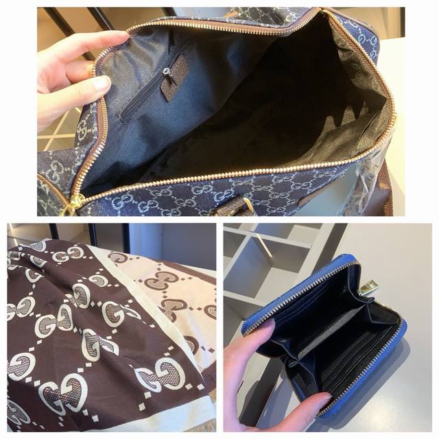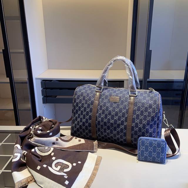 New Arrival Combo! Brand New Series Combo X868! Gucci Travel Bag + G Scarf + G Wallet. Size: Travel Bag: 46*29*21 cm. Wallet: 11*10 cm. Product Description: New Gucci boutique combo! Gucci travel bag, original denim fabric