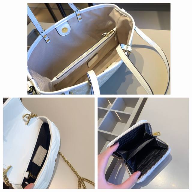 New Arrival Combo! Brand New Series Combo X871: Gucci Tote Bag + Gucci Chain Bag + Gucci Wallet. Tote Bag Dimensions: 30*18*10 cm; Chain Bag Dimensions: 16.5*11 cm; Wallet Dimensions: 11*10 cm. Product Description: New white combo from Gucci boutiques! Original fabric! Can be carried by hand or over the shoulder! Paired with the popular Gucci Marmont mini chain bag