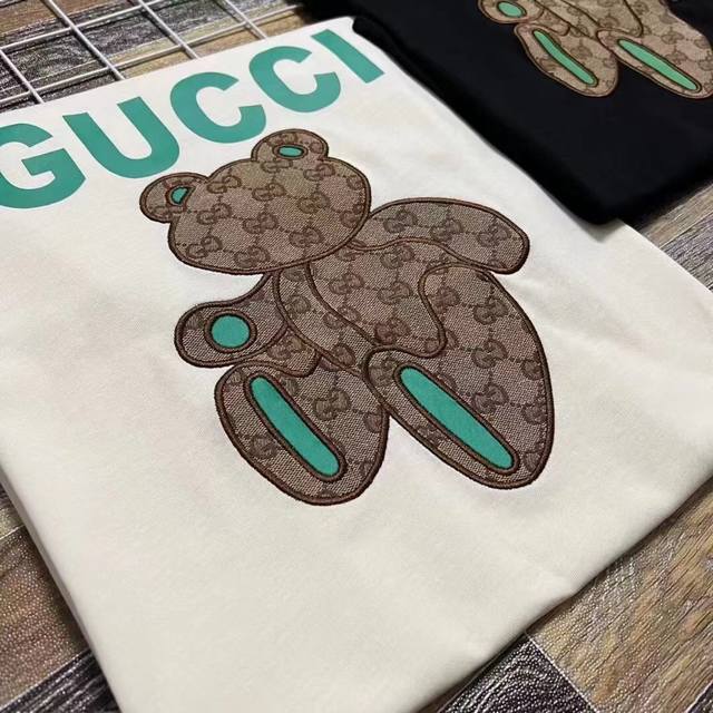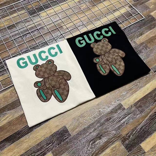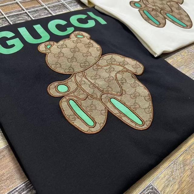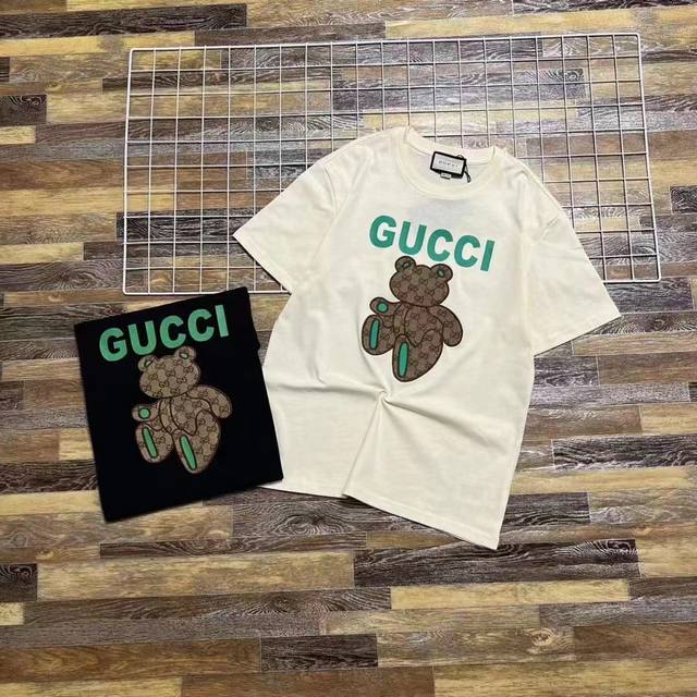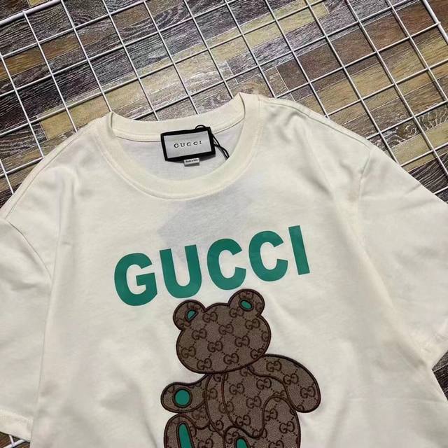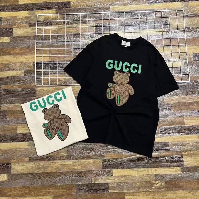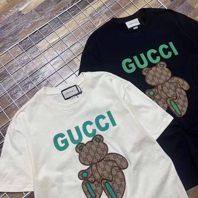 New arrival, exclusive hit, 2025 highest version, Gucci green bear patch embroidery letter print, unisex X short-sleeved loose round neck T-shirt