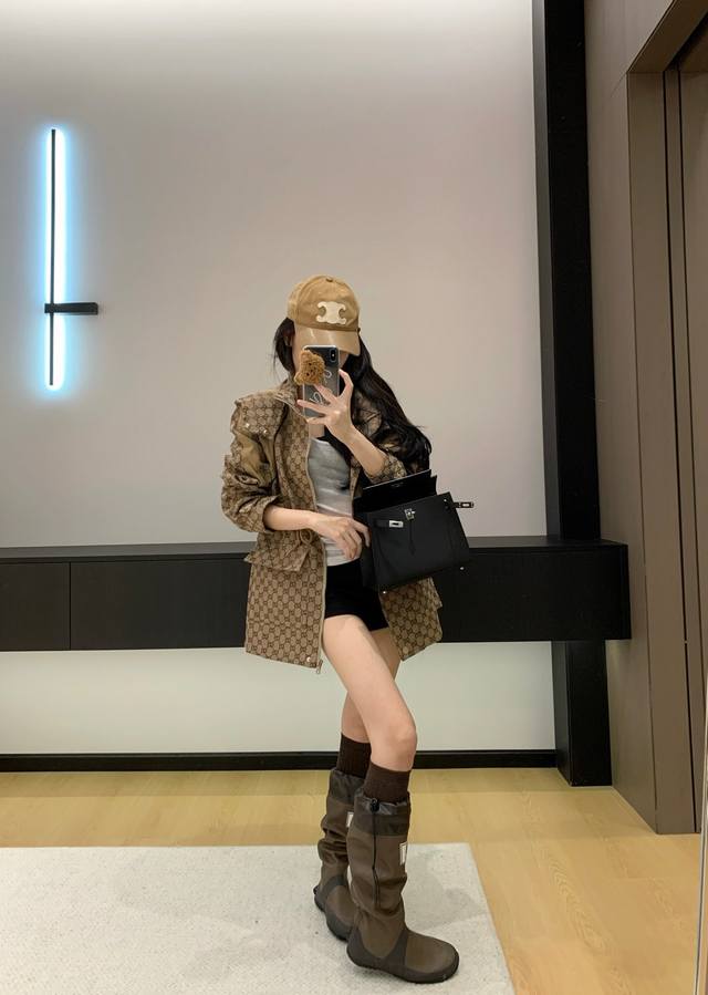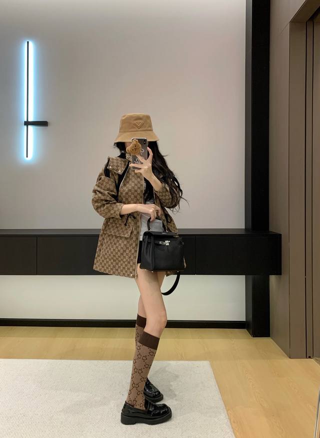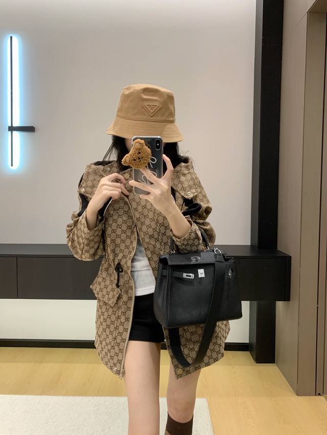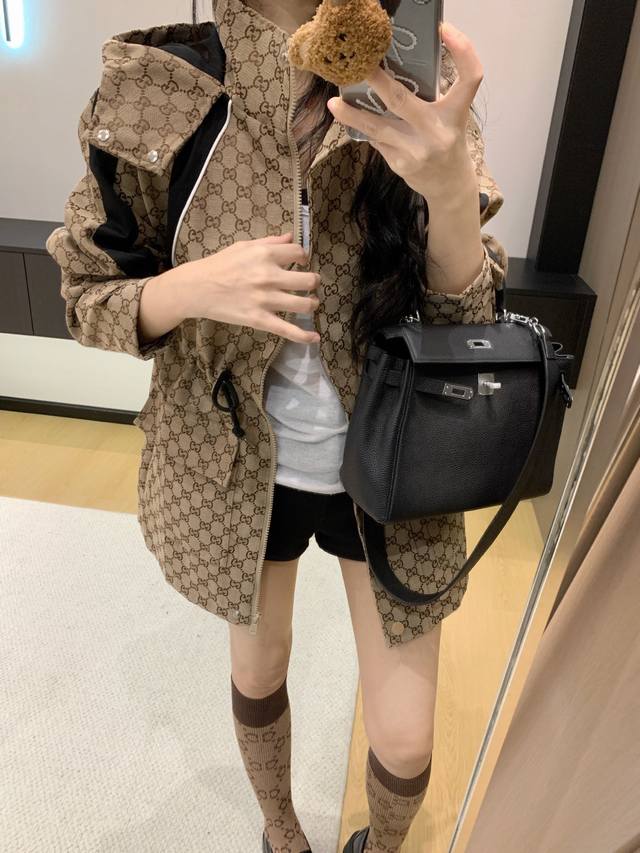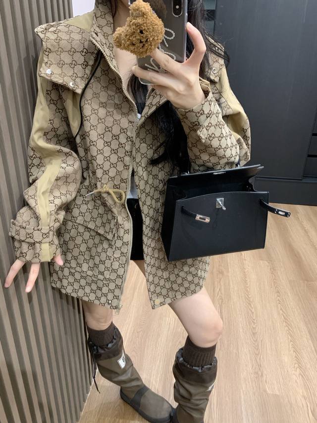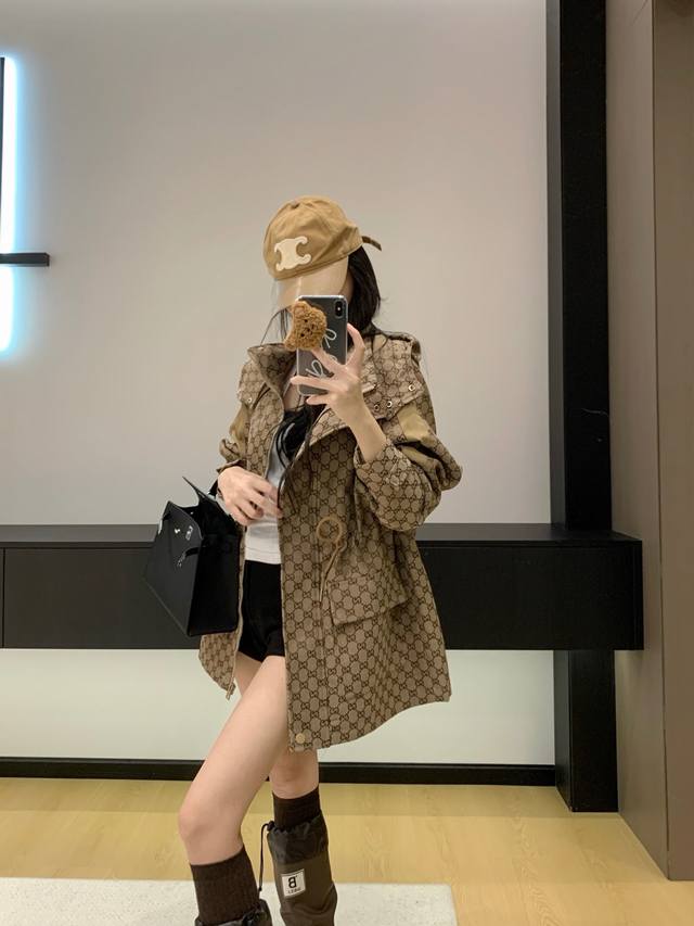Gucc* Gucci 25Ss new jacquard-patterned trench coat with workwear hood.