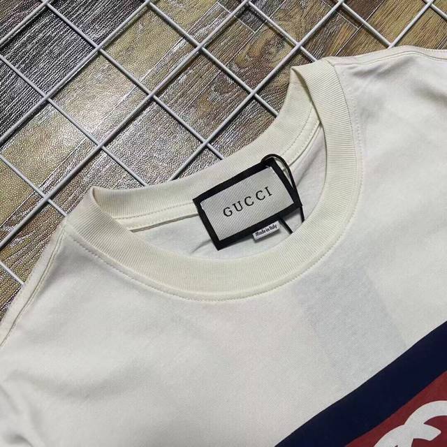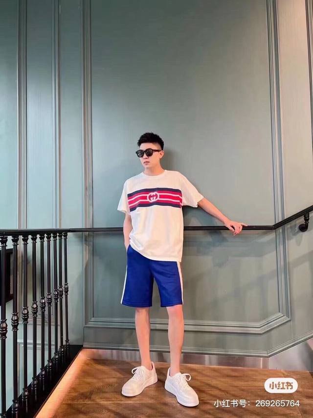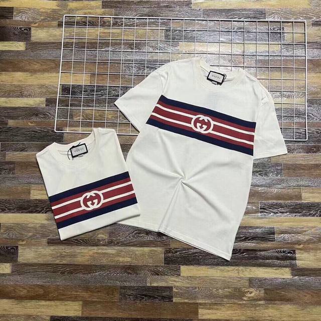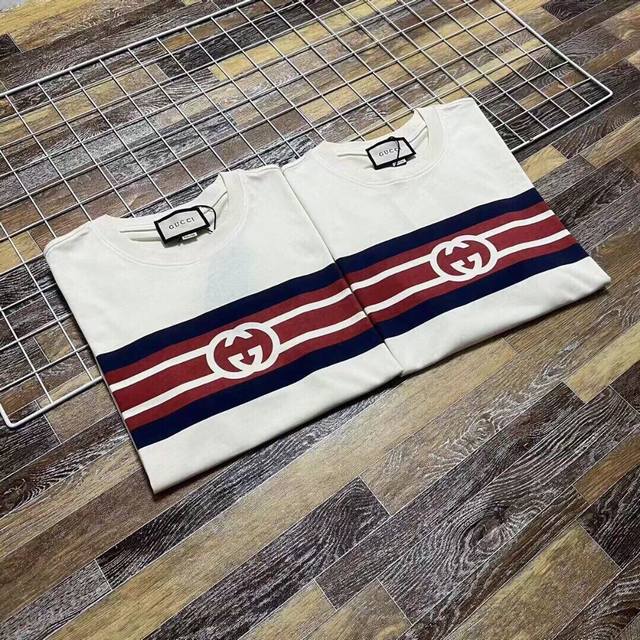 New arrival, the highest version of the internet celebrity, Gucci interlocking double G red and blue striped water print, customized version, men and women couple style round neck short-sleeved T-shirt Fabric: 260G double yarn fabric, dyed in the same vat, no color difference, no deformation after long washing, craftsmanship: the fabric is pre-shrunk in advance and does not shrink after washing, the hand-sewn red line is consistent with the official website, printing: imported machine positioning brushing, alignment, long washing and no cracking, accessories: customized original quality, invincible difference in market currency packaging: customized Logo packaging bag makes the packaging more upscale, difference in currency
