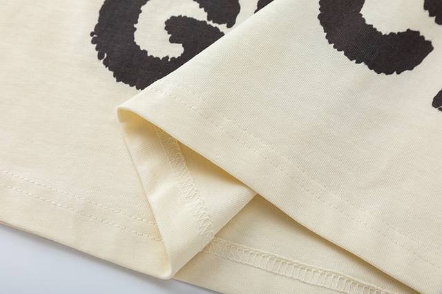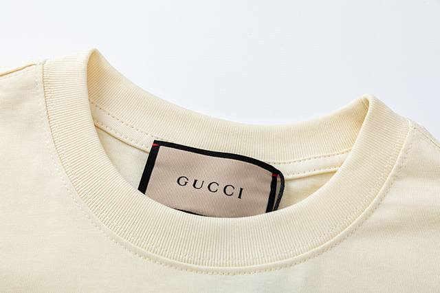Style No.: 341, Ddd Gucci New Arrival! High-weight, seamless print short-sleeved T-shirt. Made from custom-supplied 100% pure cotton knit fabric, the material is delicate to the touch, thick and textured. The high-density machine weaving process creates a soft, comfortable, and bouncy feel, like cotton wool. It has a crisp texture and looks great on. The exquisite and full-bodied design perfectly showcases the brand's high-end style. It looks great whether worn alone or layered. The loose fit makes it easy to wear. Sizes: S (Recommended for 80-120 lbs), M (Recommended for 120-145 lbs), L (Recommended for 140-165 lbs), XL (Recommended for 160-190 lbs). Available Color: Apricot.