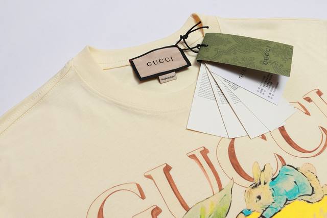 Style No.: 886, Gucci New Arrival! Early Spring Collection High-Weight Short-Sleeve T-Shirt. Made with custom-supplied 100% pure cotton knit fabric, the material is delicate to the touch, thick and textured. The high-density machine weaving process creates a soft, comfortable, and bouncy feel, like cotton wool. It has a crisp texture and looks great on. The exquisite and full-bodied design perfectly showcases the brand's high-end style. It looks great whether worn alone or layered. The loose fit makes it easy to wear. Sizes: S (Recommended for 80-120 lbs), M (Recommended for 120-145 lbs), L (Recommended for 140-165 lbs), XL (Recommended for 160-190 lbs). Available Color: Apricot.