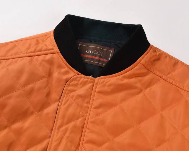 Top-tier Gucci reversible quilted jacket in green and orange, featuring an exaggerated design that presents the classic double G logo in a unique way. This jacket is a unisex piece in the Aria collection, showcasing various ready-to-wear and accessory items. Color: Luxurious green + orange. Sizes: M, L, XL, 2XL. Style number: C3310.