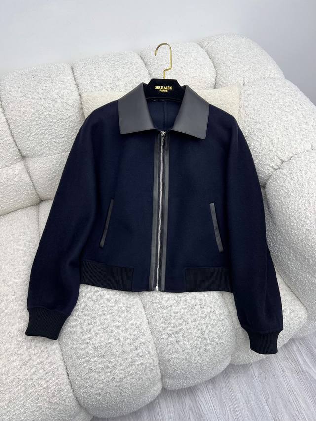 Contrasting leather trim on the collar and placket