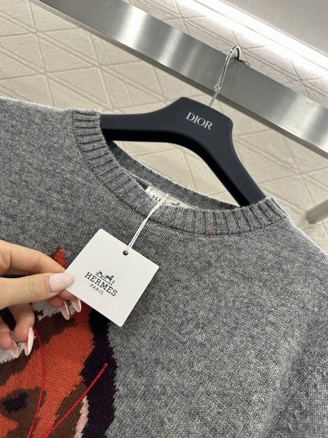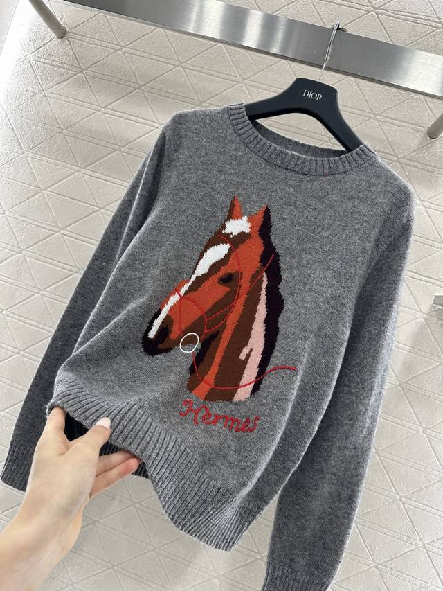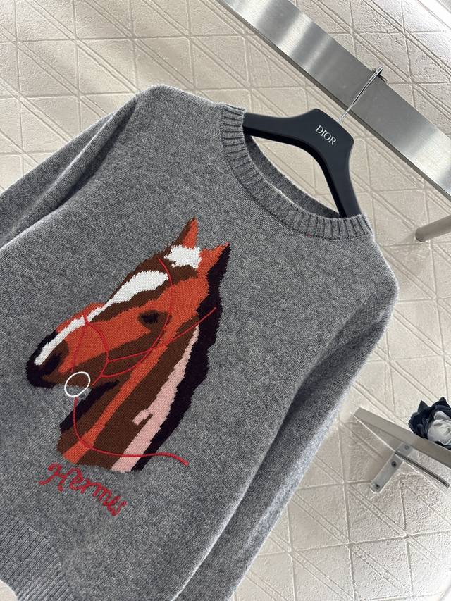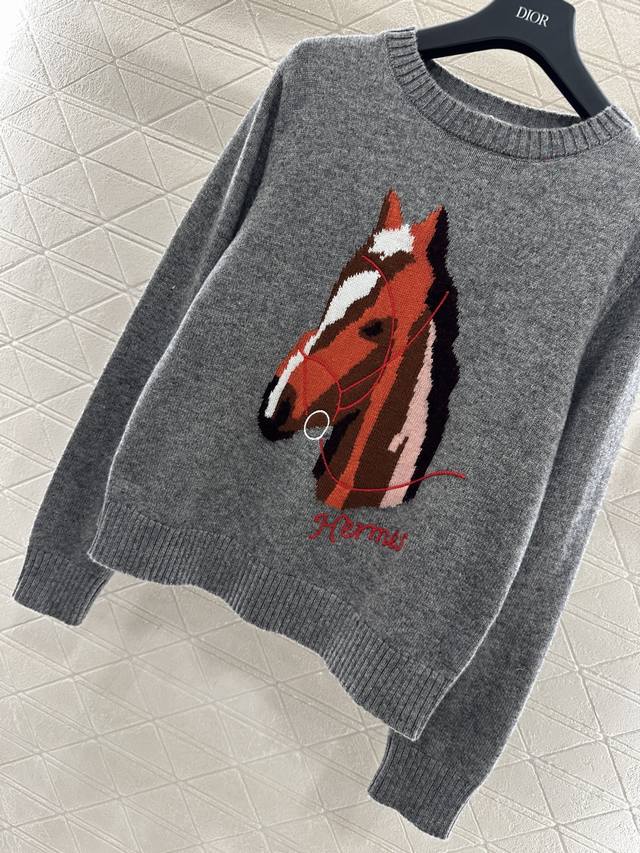 Herme*2026 New Arrival Ddd Lunar New Year Jacquard Horsehead Knit Sweater Ddd New Year's Series # Custom Yb wool yarn knitting, comfortable to wear, full of texture, round neck knit pullover long sleeve sweater cut, heavy-duty horsehead jacquard pattern with rich color layering, red and brown color blocking is particularly eye-catching on the gray base, soft and warm wool material is skin-friendly, simple round neck design is versatile and suits everyone, can be worn alone to become the focus of the look, understated yet full of design sense~ understated dark gray base color, color collision has its own recognition, can be worn alone to create a casual yet elegant Parisian style, the eye-catching outfit of autumn and winter can be made with this sweater, the clean cut outlines a casual fashion sense, the outfit is lazy and stylish. Custom fabric and accessories, look for the high version gray DDD