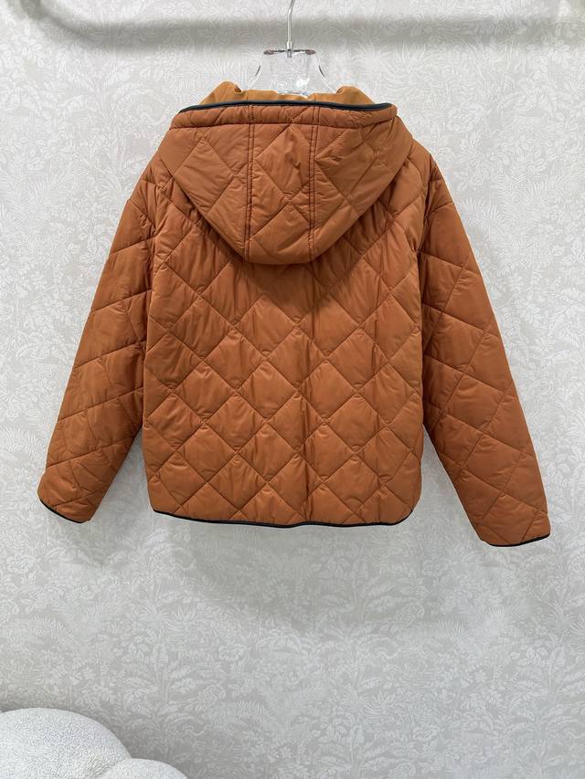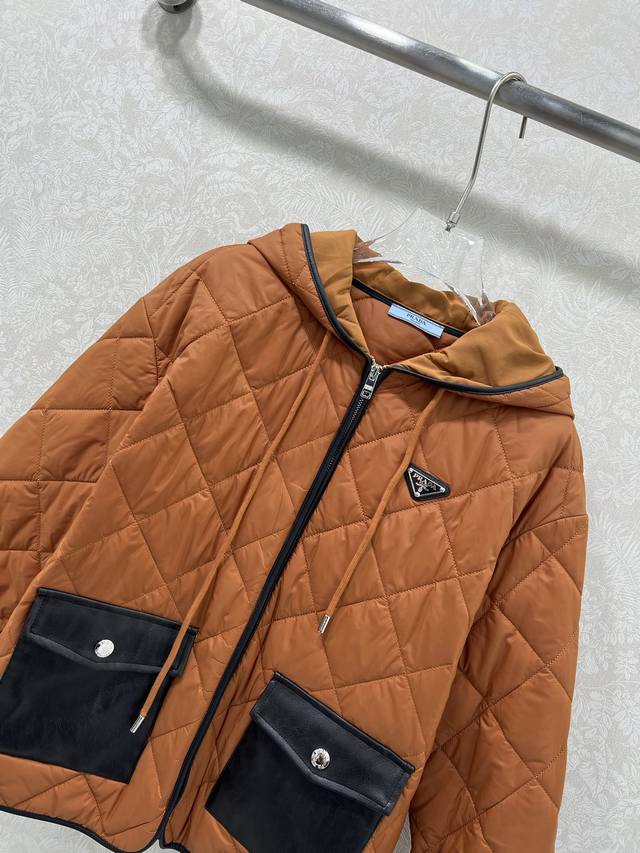 prad*25 New Hooded Diamond Pattern Cotton Coat - The superb Hermes orange breaks the dullness of autumn and winter. Features a front leather patchwork design, large pockets, and a classic triangular logo on the chest. The details are superb, adding visual depth without looking bulky. It has a casual and cool feel, perfect for everyday wear. Easily achieve a sweet and cool girl vibe. Single color, size 3, Smlb. DDD