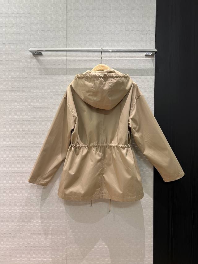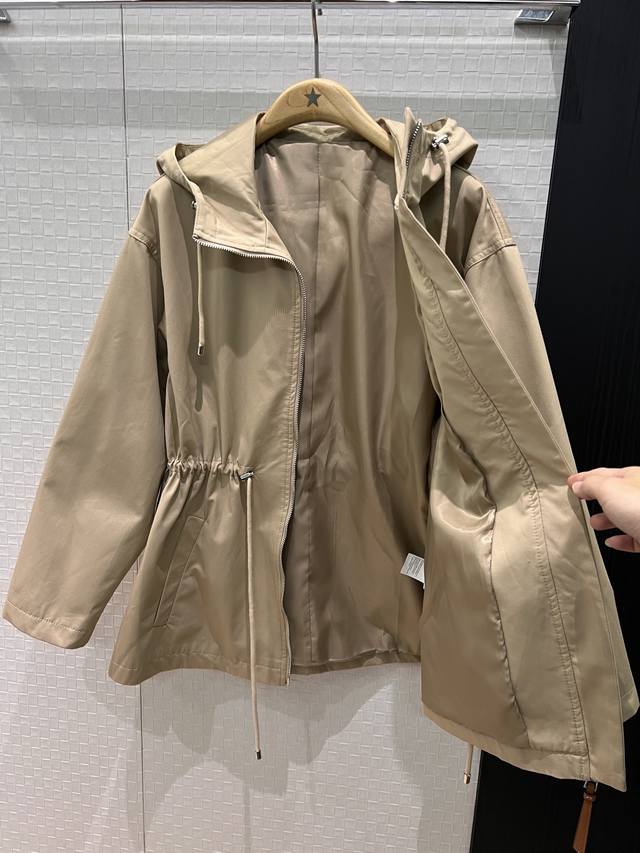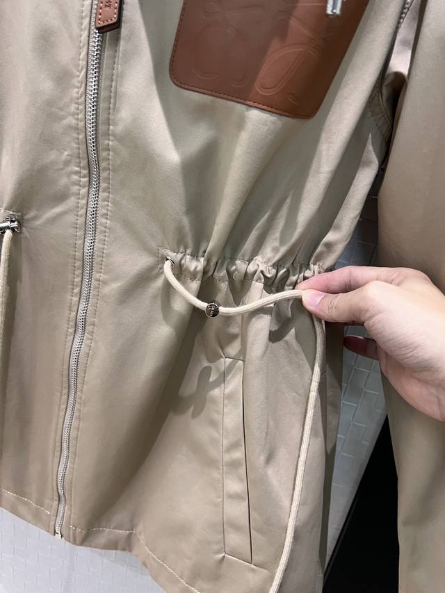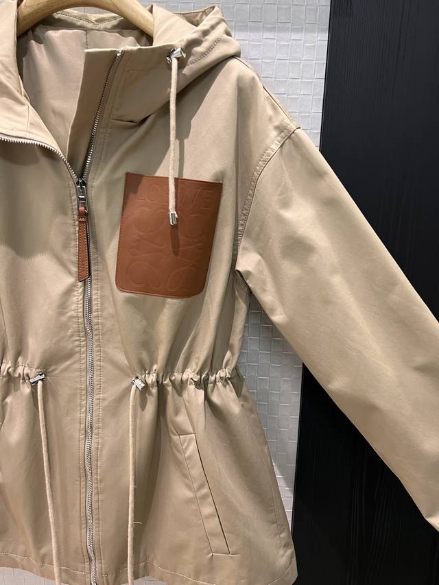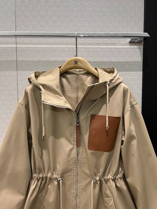 New Arrival Recommendation: Early Spring Loewe Hooded Drawstring Waist-cinching Jacket with Classic Logo and Leather Pockets. Features a slimming waist, a relaxed fit, casual style, and side pockets for a youthful and chic look. Available in Black, Khaki, Sizes 5ml, 8ml, and 9d.
