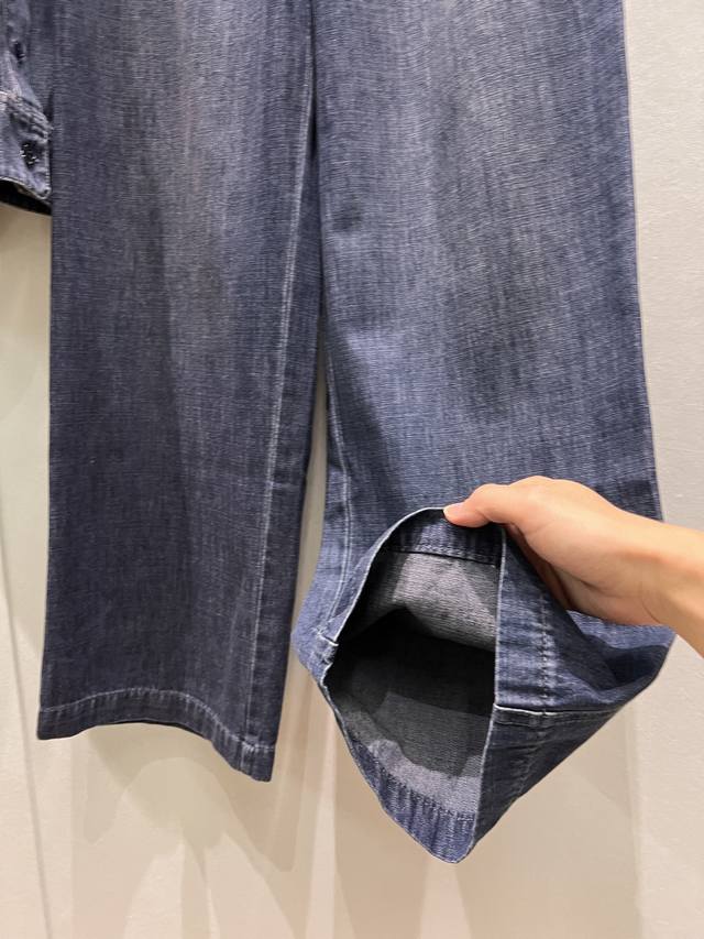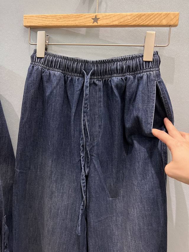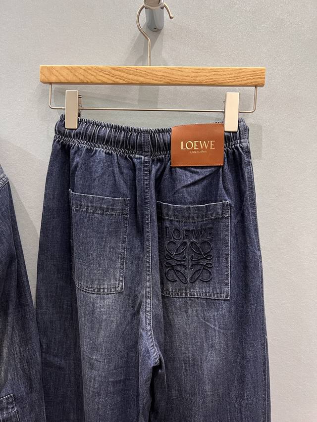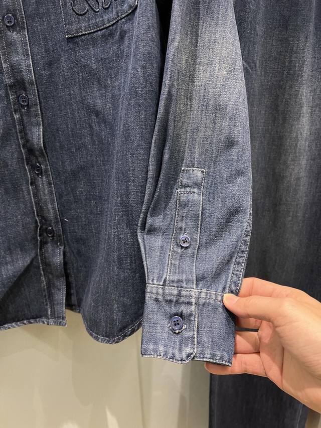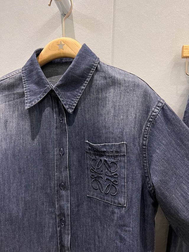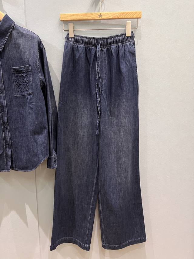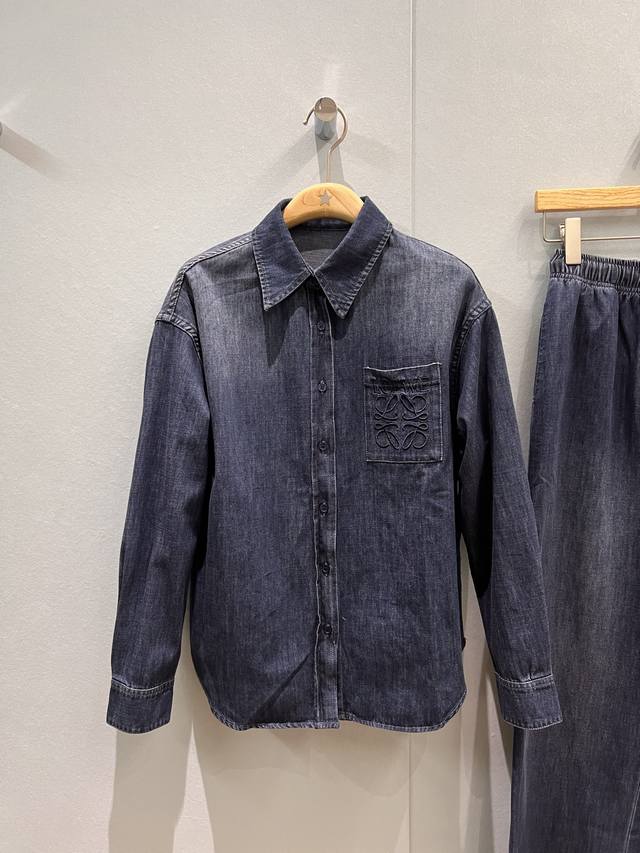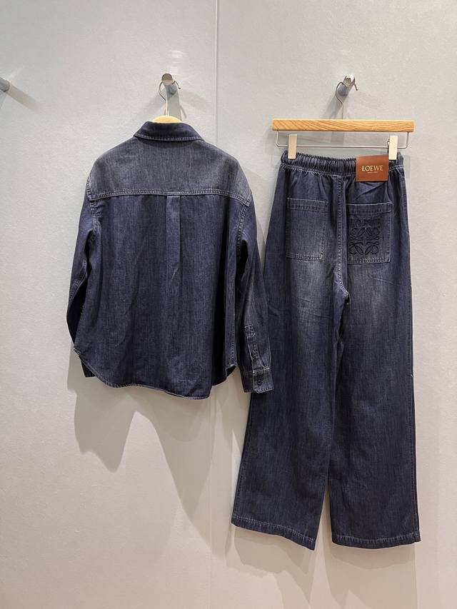 New shirt and pants are coming: Loewe embroidered three-dimensional logo badge washed denim shirt elastic waist wide-leg denim pants with gradient wash positioning, vacation leisure and versatile essential lazy age reduction Sml