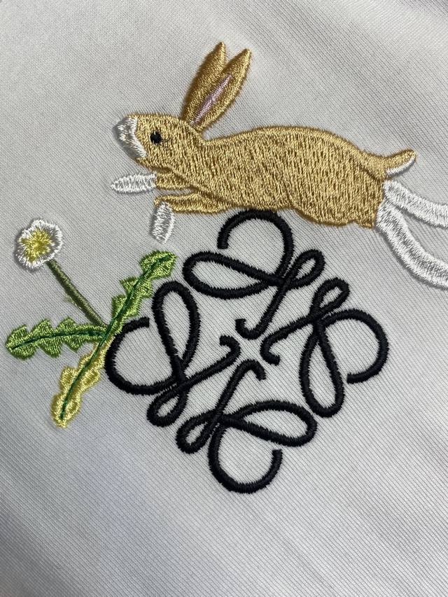 # Bunny motif embellished with Loewe embroidery. The main body is embroidered with precision needlework; the embroidery is extremely fine and dense, resulting in a clear, linear, and three-dimensional pattern. The linen embroidery thread is combined with encryption processing, and the embroidery body has a subtle matte visual texture; the embroidery effect is three-dimensional and full. The flat embroidery has a unique design of stitching, and the embroidery is very fine and dense; the overall stitches are fine and dense, and the fineness and texture are consistent, which adds a sense of layering to the simple design.