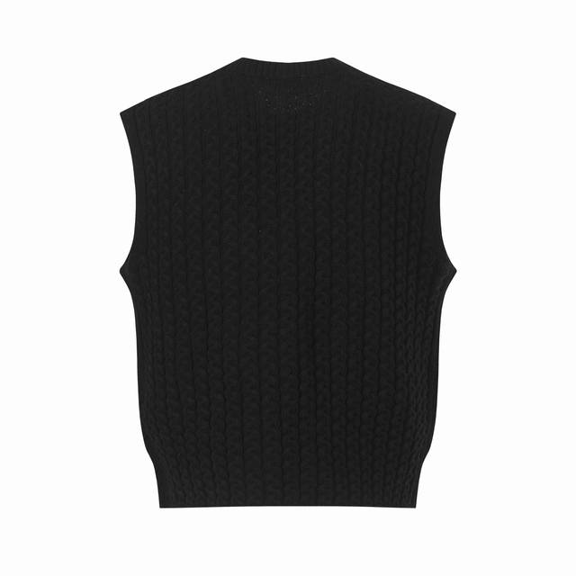 Medium-weight wool vest with hand-stitched anagram on the front. Cable vest