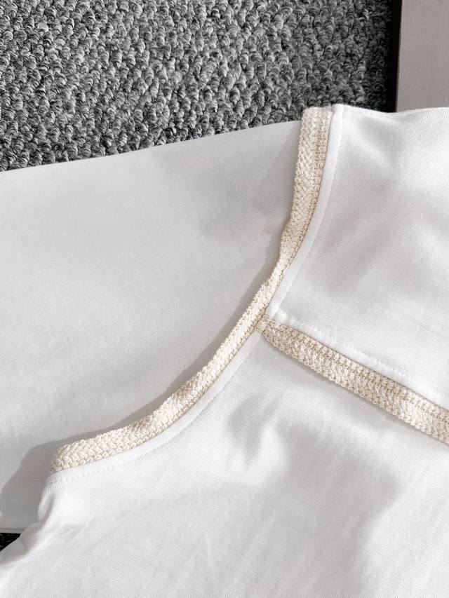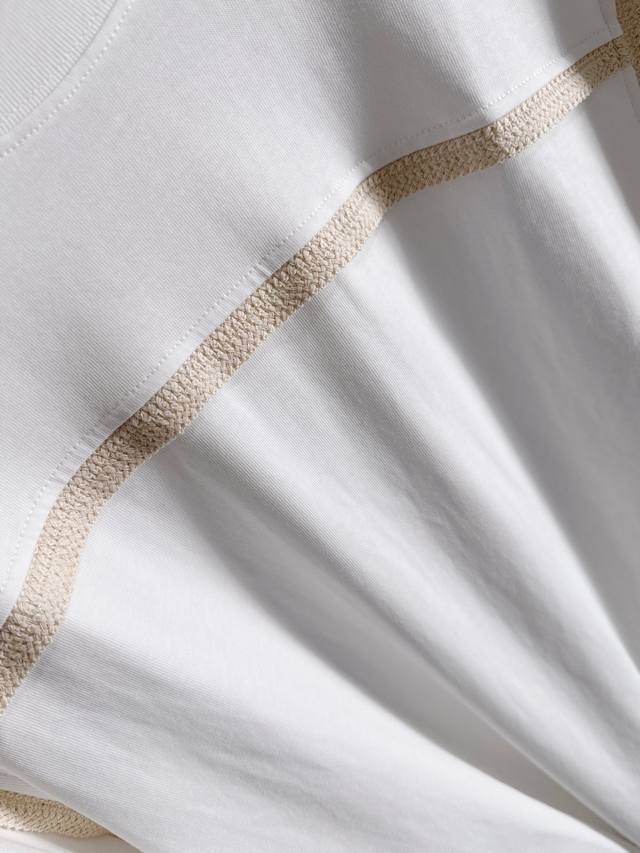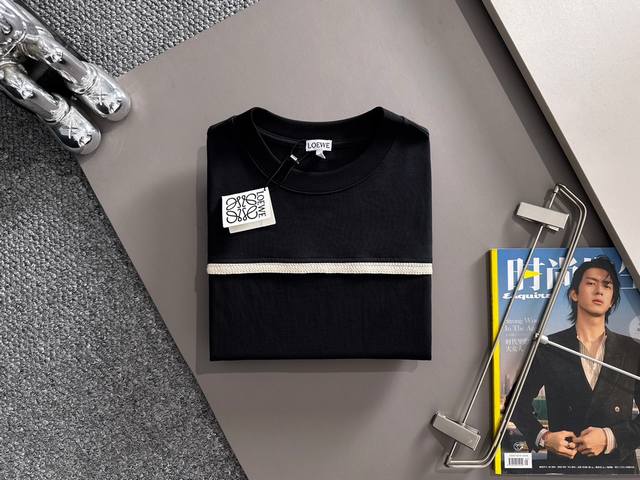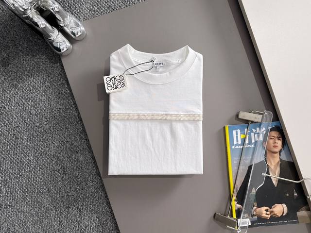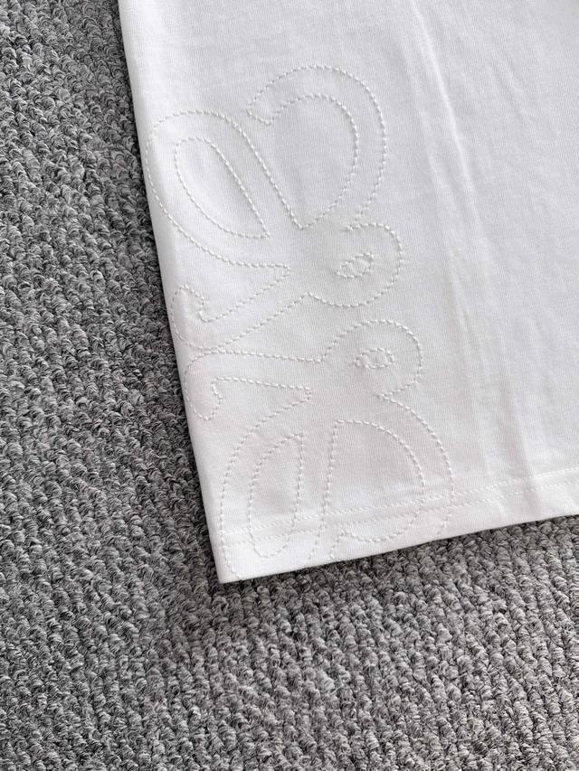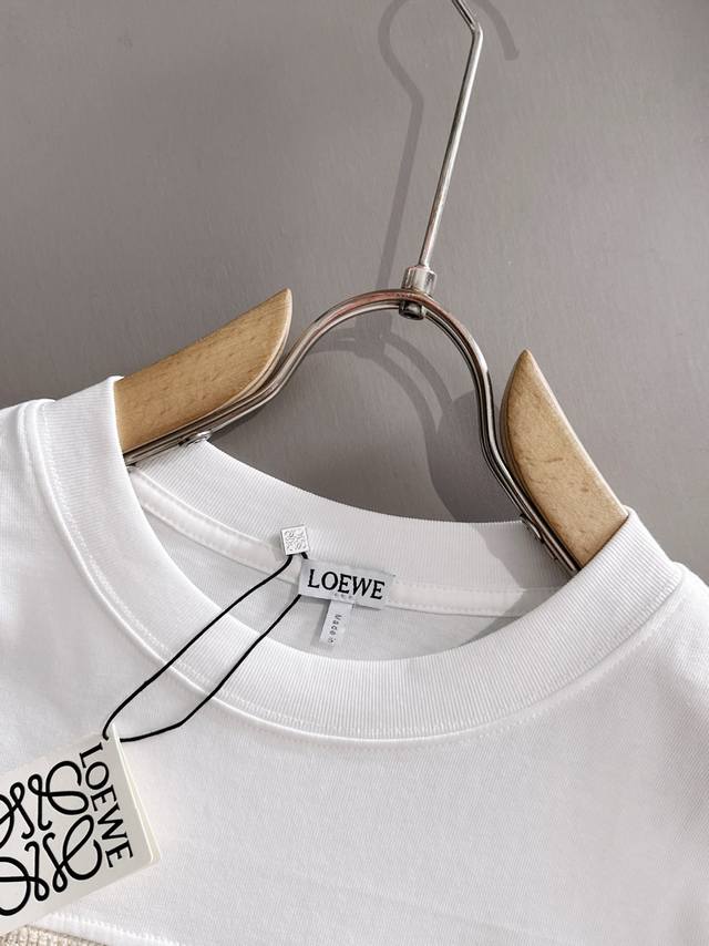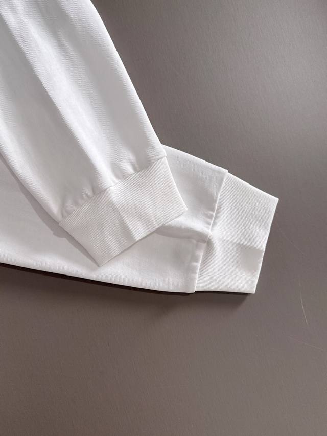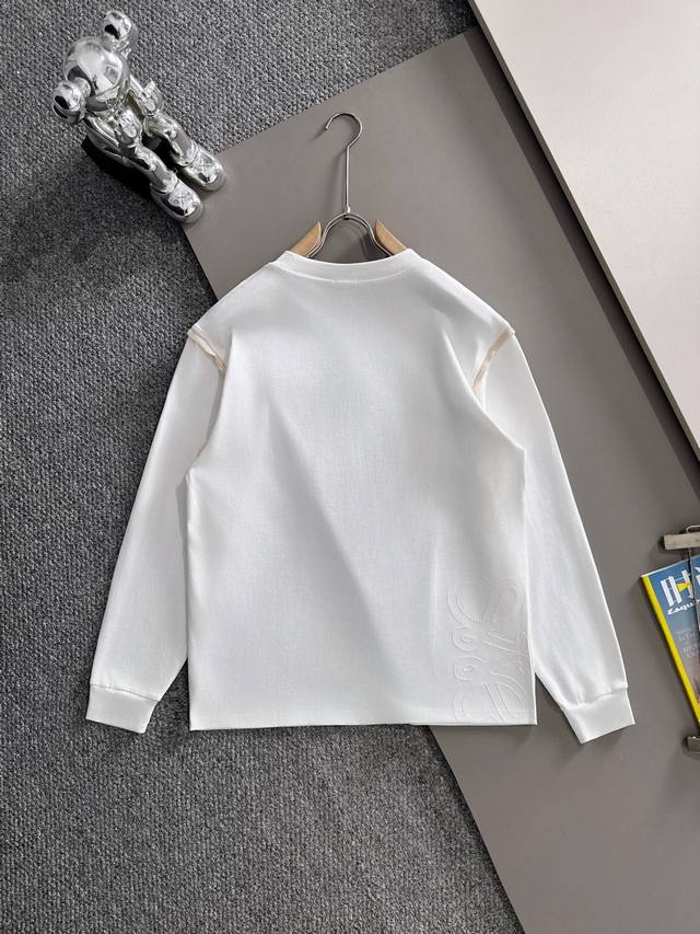 Loewe's new 2025 collection features a patchwork hem with an embroidered logo and a flocked waistband. Unisex long-sleeved T-shirt. Made from custom 280g cotton. Custom-dyed with 32-count double-strand thread. Complete with collar, hangtag, and main label. Color: White. Sizes: XS, S, M, L,