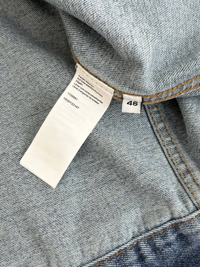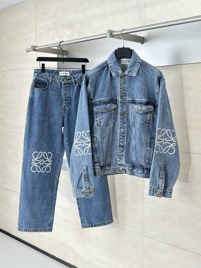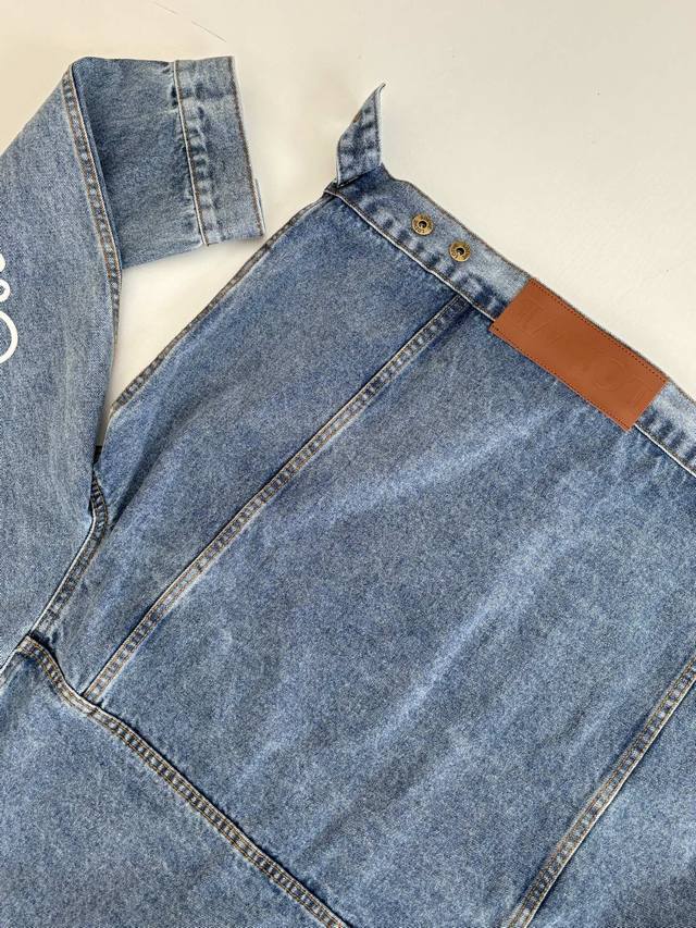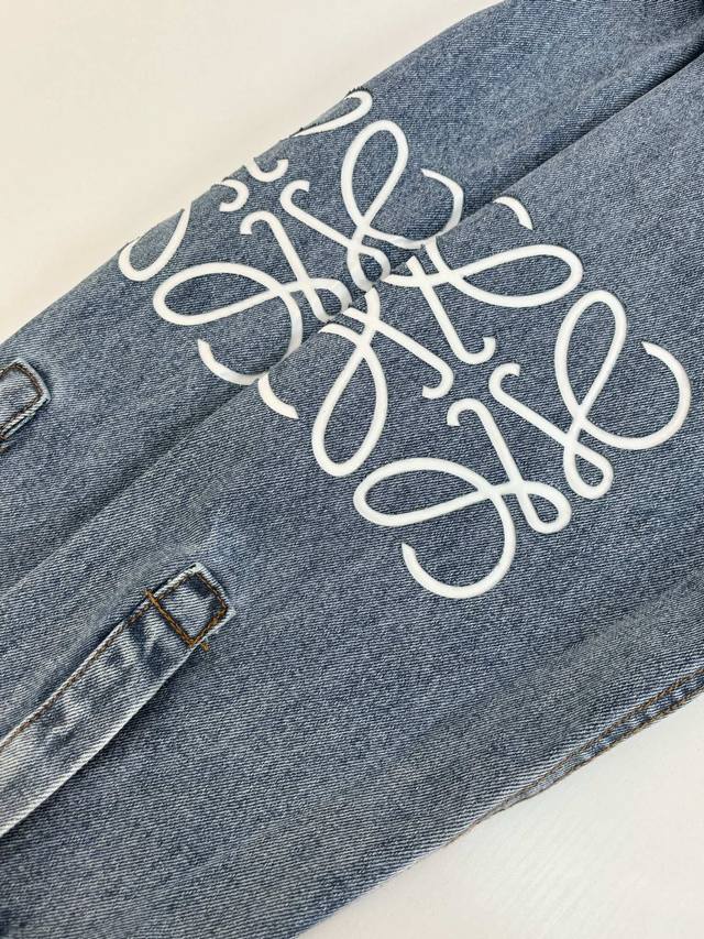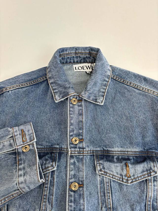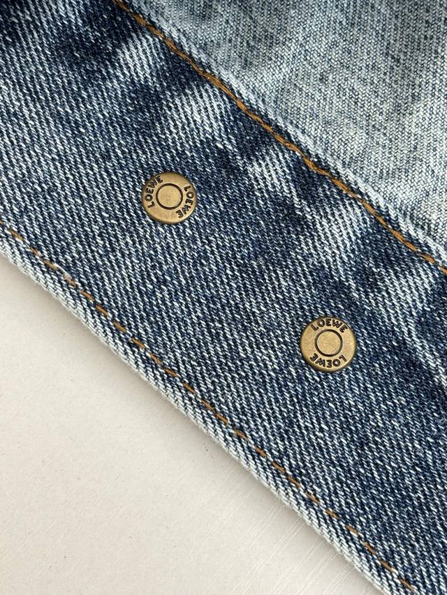 Loew* 24Fw Anagram Denim Jacket DDD. Made with high-density, thickened, tightly woven double-core yarn on a black base and black surface, offering a comfortable and luxurious feel against the skin. The elbows are adorned with an Anagram cutout design. The front features a buttoned flap and welt pockets for added elegance. The classic Loewe leather label on the back adds a touch of visual distinctiveness, making it a statement of personality and taste. The Anagram pattern is laser-cut and then manually cut out from the elbows, followed by hand-applied internal fabric and finally hand-sewn on. The jacket uses a washing and dyeing process, prioritizing the use of a special desizing agent before soaking the fabric. DDD Size: 46 48 50 52 DDD