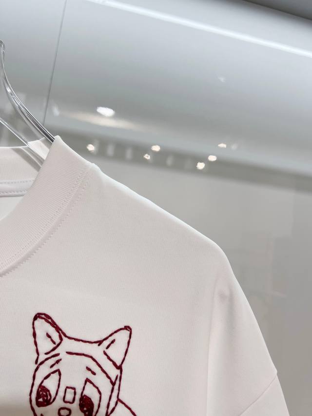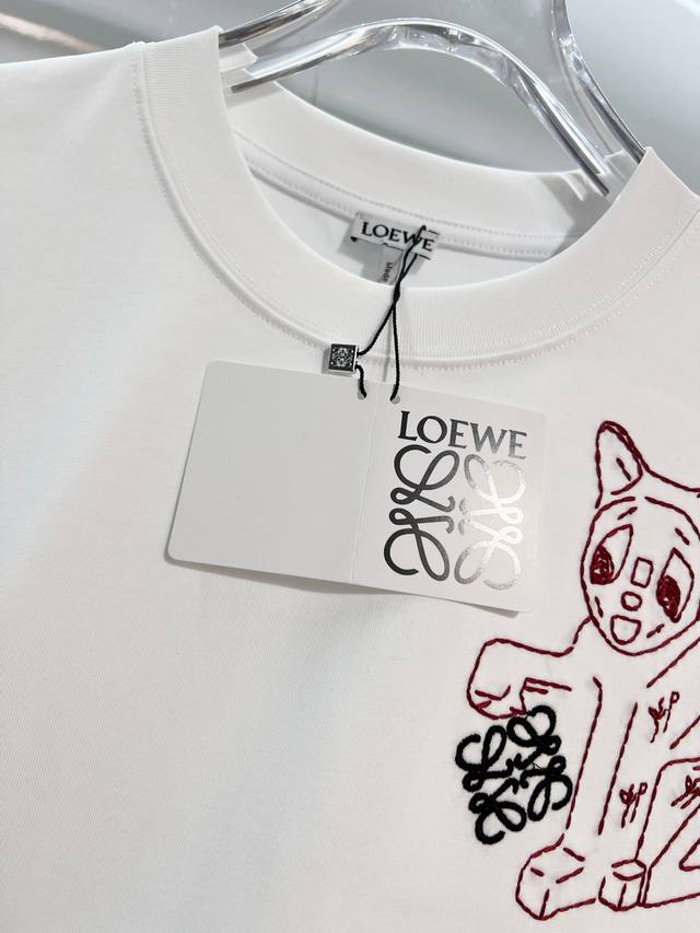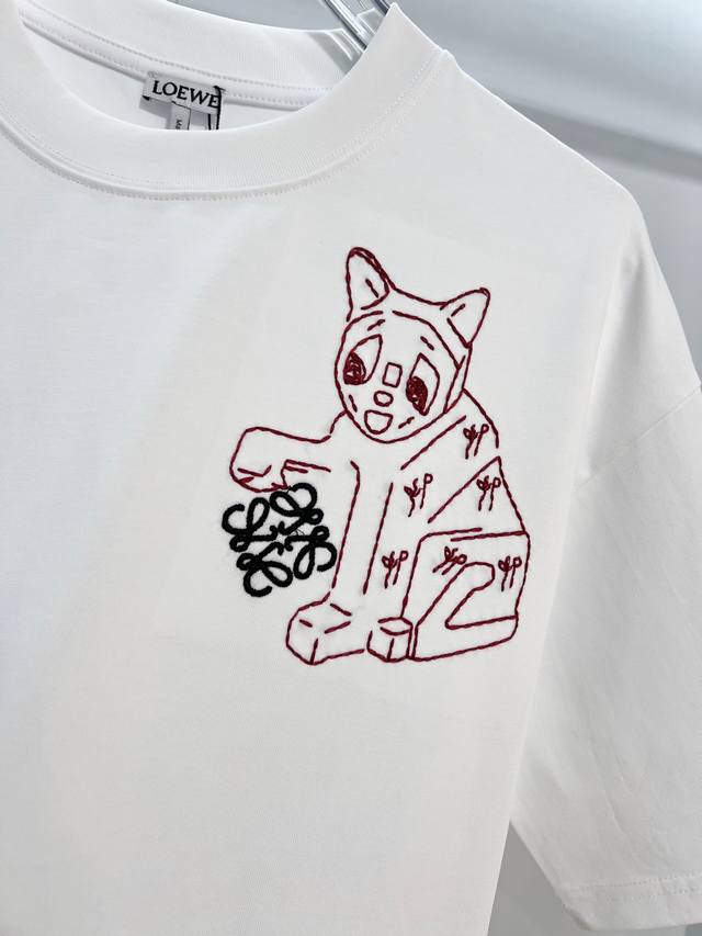 Loewe 2026 New Line Knit Embroidered Kitten Logo Unisex Short-Sleeve T-Shirt, Custom 320g 100% Double Yarn Pure Cotton Fabric, Custom Dyed 32-Count Double-Strand Ribbed Fabric, Complete with Neck Label, Hang Tag, and Main Label, Color: White, Sizes: S, M, L, XL
