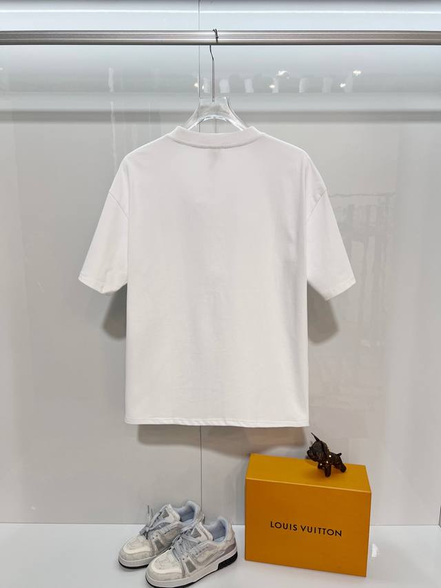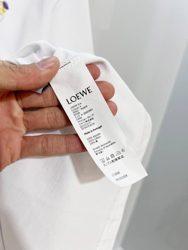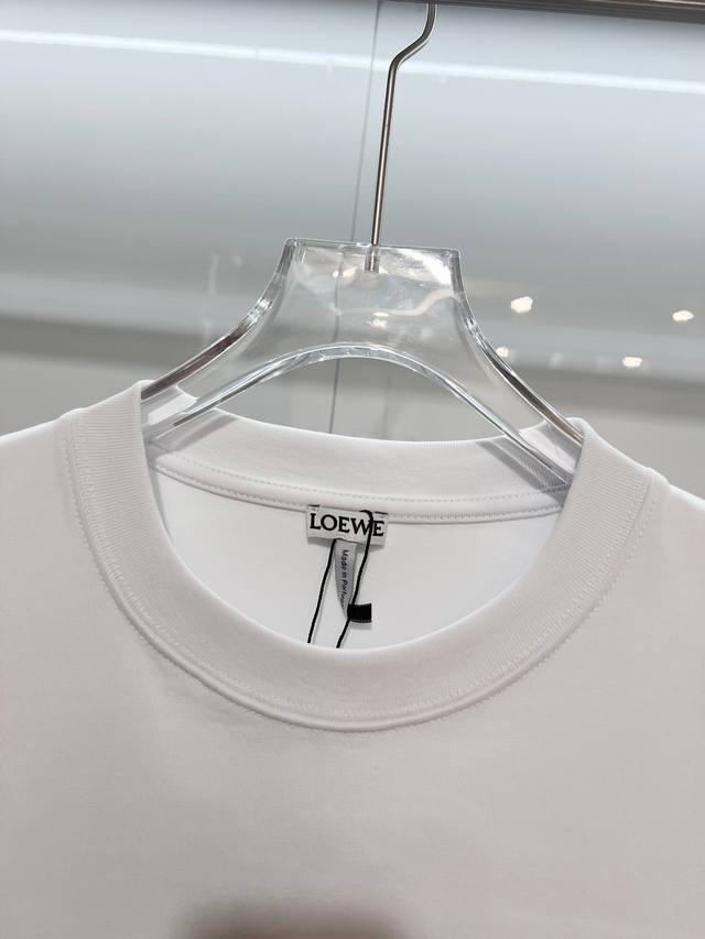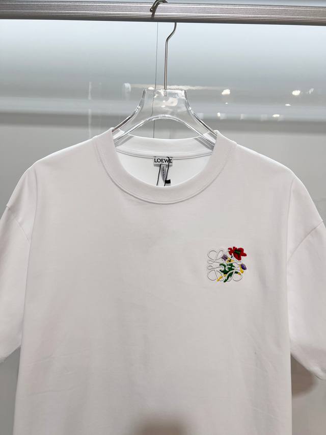 Loewe 2026 New Style Official Website Synchronized Imported High-Density Embroidered Rose Letter Logo T-Shirt for Men and Women. Custom 320g 100% Double Yarn Pure Cotton Fabric. Custom Dyed 32-Count Double-Strand Ribbed Fabric. Complete with Neck Label, Hang Tag, and Main Label. Color: White. Sizes: S, M, L, XL.