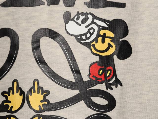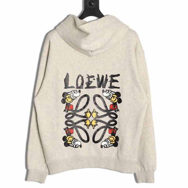 Loewe 25Fw Mickey Mouse Print Hoodie. This hoodie is made of 100% pure cotton knit fabric, with a fabric weight of approximately 320g. It features a 1*1 vertical ribbing, custom-woven and dyed for color matching. The print on the front, back, and chest uses a white ink heat transfer process, making it less prone to cracking and fading after washing. It undergoes a garment-washing process. The collar and cuffs are double-stitched, and the hem is finished with a four-needle, six-thread visible stitch. It comes with a full set of accessories, including a custom-made neckline strip that is comfortable against the skin. Sizes: S-XL.