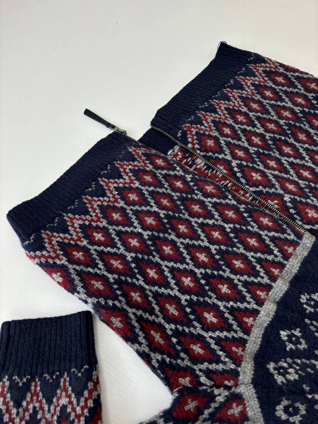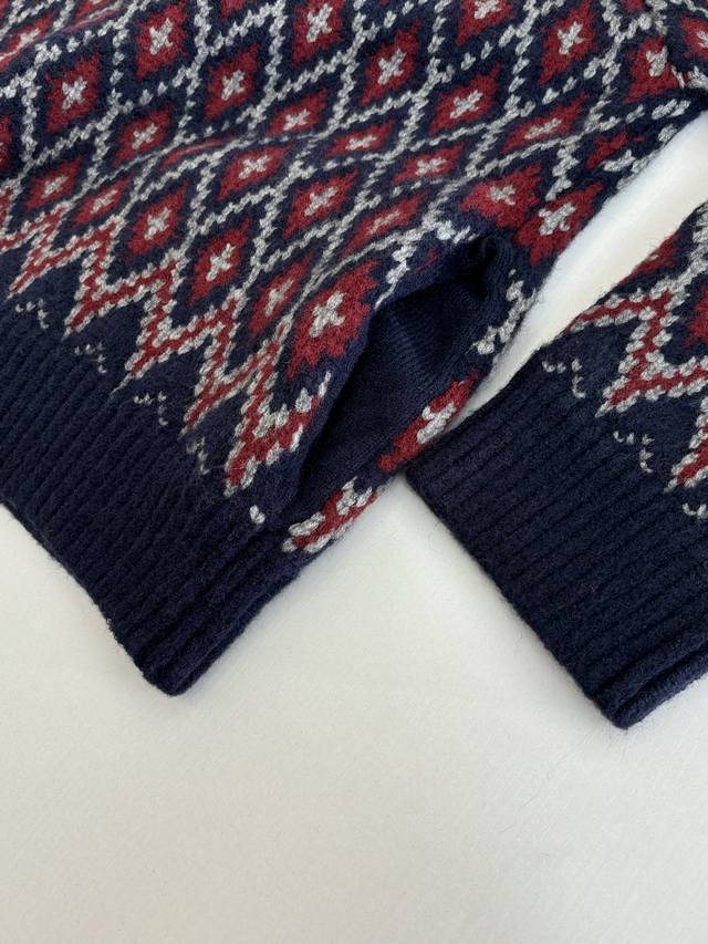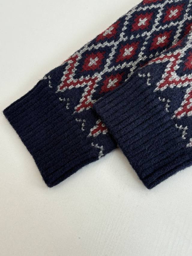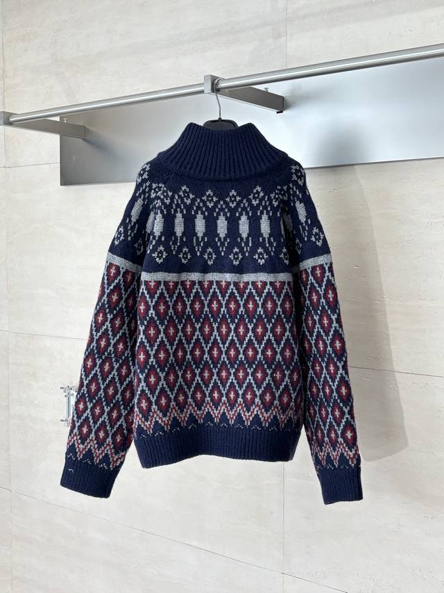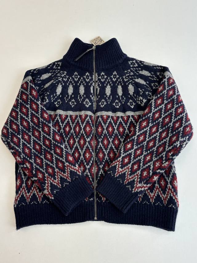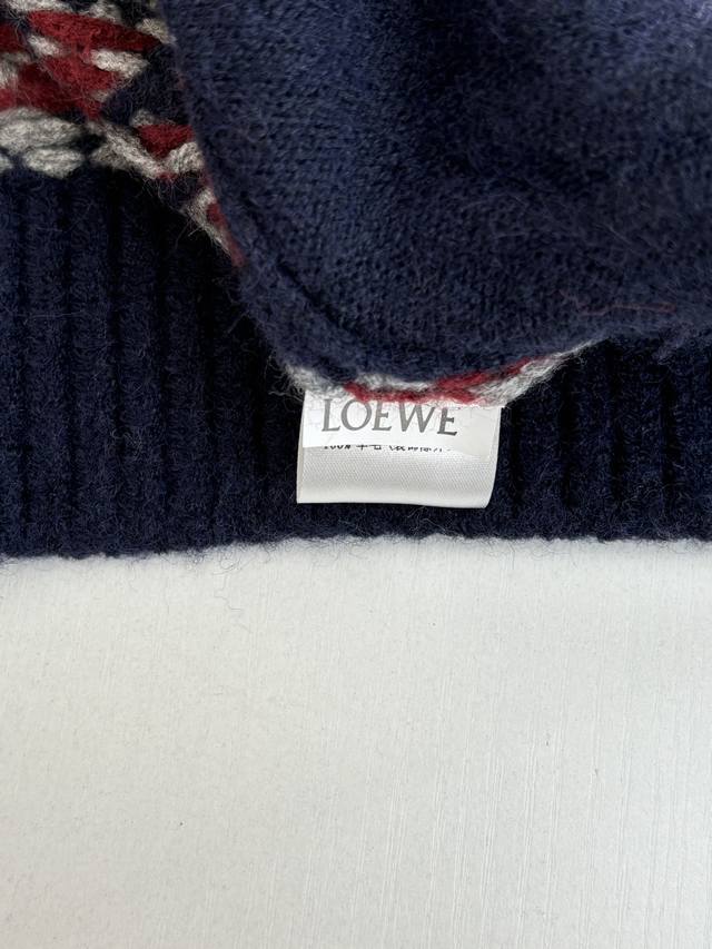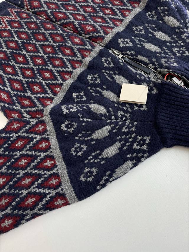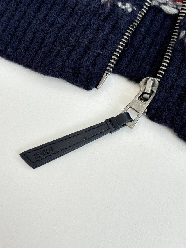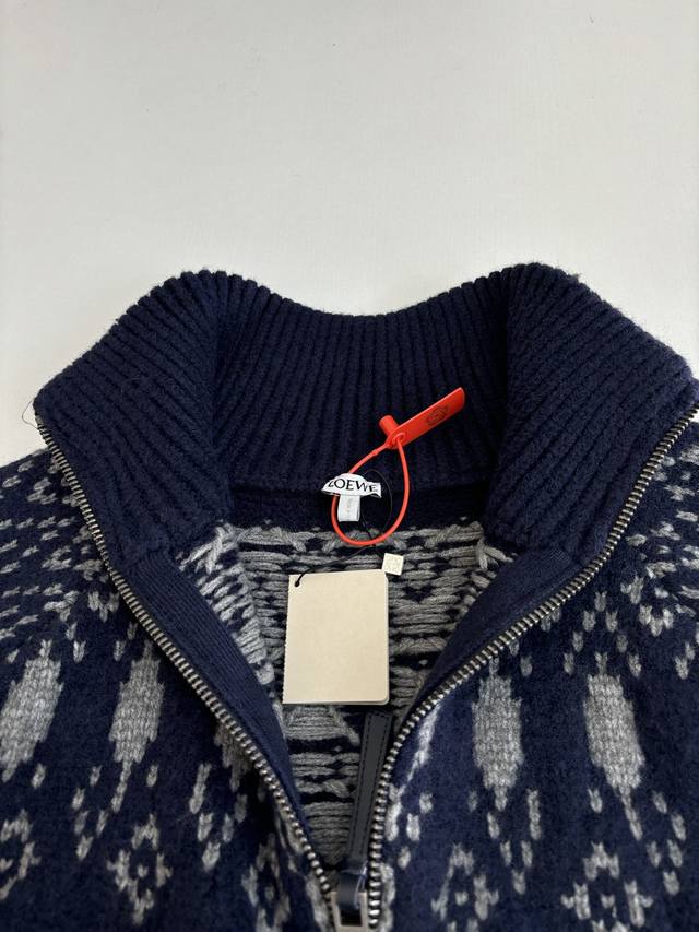 Loewe* 25Fw New All-over Geometric Sweater Coat DDD Custom-made snow-white ribbed jacquard wool with a rich, thick, and solid texture. Every inch of fiber contains a heavy warmth. Navy blue as the base, red and white as the flame, gives the colors dynamic saturation. The Fair Isle pattern is presented in an asymmetrical diamond order, rising to become a declaration of new Nordic aesthetics. The exquisite zipper design is cleverly integrated into the knitted coat, instantly revitalizing the coat. The heavy texture is everywhere, showing its luxurious charm and defining extraordinary taste. German imported jacquard machine is used to precisely control the arrangement and interlacing of the yarns. The Fair Isle jacquard art pattern is carefully woven on the loom, making the fabric more vivid and three-dimensional. DDD Size: SML XL DDD