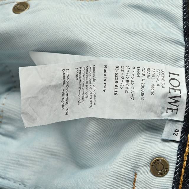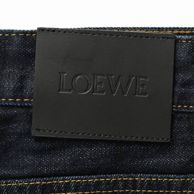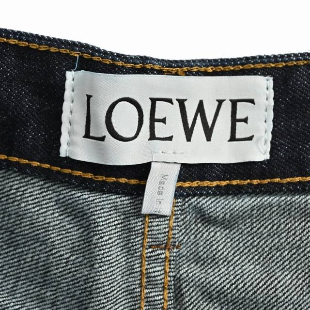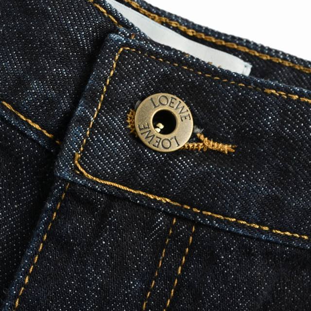 Customized elegant rough twill denim material, laser technology, the use of high-energy laser beams to accurately process the surface of the material, by controlling the intensity, frequency and scanning speed of the laser beam, can achieve high-precision Loewe Anagram engraving work, using sand frying hand rubbing technology, through the sand frying machine to make the surface of the jeans fade and wear naturally, and then use special tools to physically damage the surface of the jeans by hand, maintaining the original texture and details while increasing its uniqueness, heavy washing and whitening process, through physical and chemical means, the denim fabric is deeply treated multiple times to make the surface of the pants appear gray, and then the denim fabric is polished by machine to make the surface of the pants have a worn effect, customized accessories, fitted version