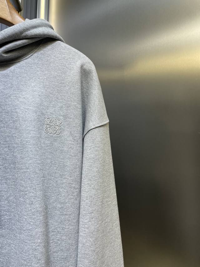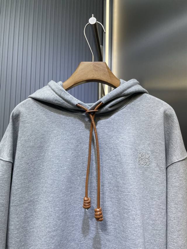 Leather Embroidered Hooded Sweatshirt. Custom-made with a unique style. The fabric is made of soft and comfortable cotton fleece, with a crisp and stylish look. The pure black base outlines a simple yet sophisticated silhouette. The iconic Loewe Anagram embroidery adorns the chest, paired with a Flamenco-style leather drawstring, adding a touch of unique charm. Understated yet sophisticated, it allows for easy mixing and matching, releasing individual style. Craftsmanship 1: Utilizes imported machine embroidery technology, employing an advanced computer control system and precision mechanical parts to achieve high precision in Loewe Anagram embroidery, resulting in smooth and delicate lines. Craftsmanship 2: All fabrics undergo a water-washing process for a better feel and texture, making them less prone to deformation, shrinkage, and fading, maintaining a long-lasting beauty. Accessories: Custom 1:1 Flamenco leather drawstring. Custom 1:1 Loewe logo. Fit: Loose fit . Sizes: S, M, L, XL.