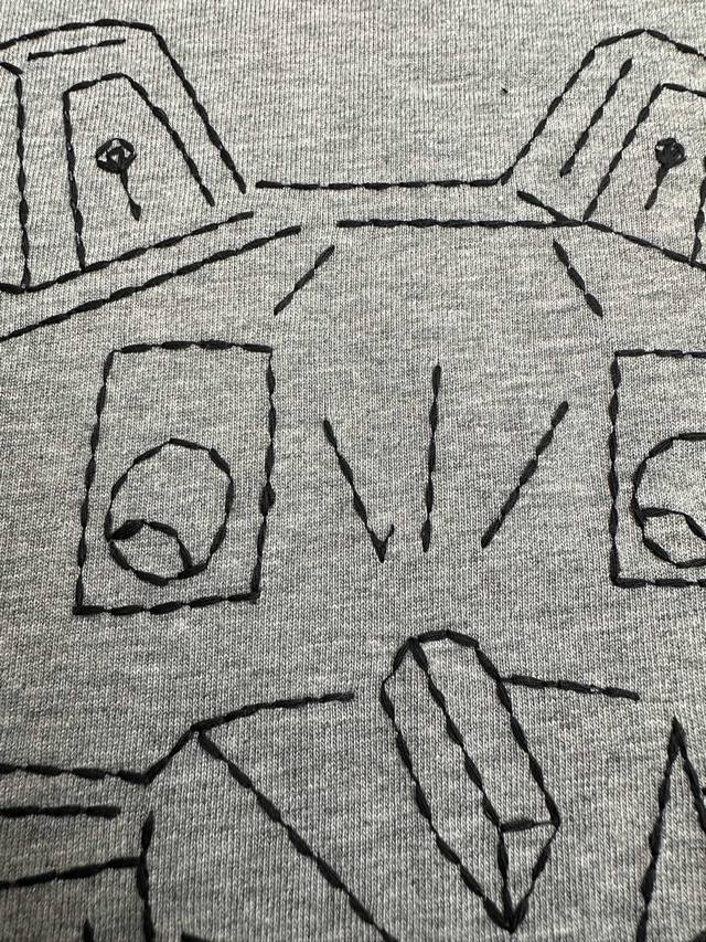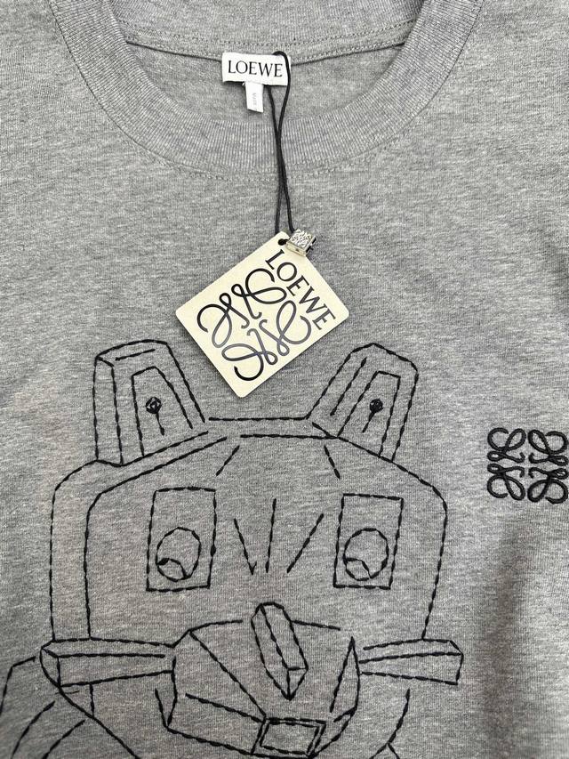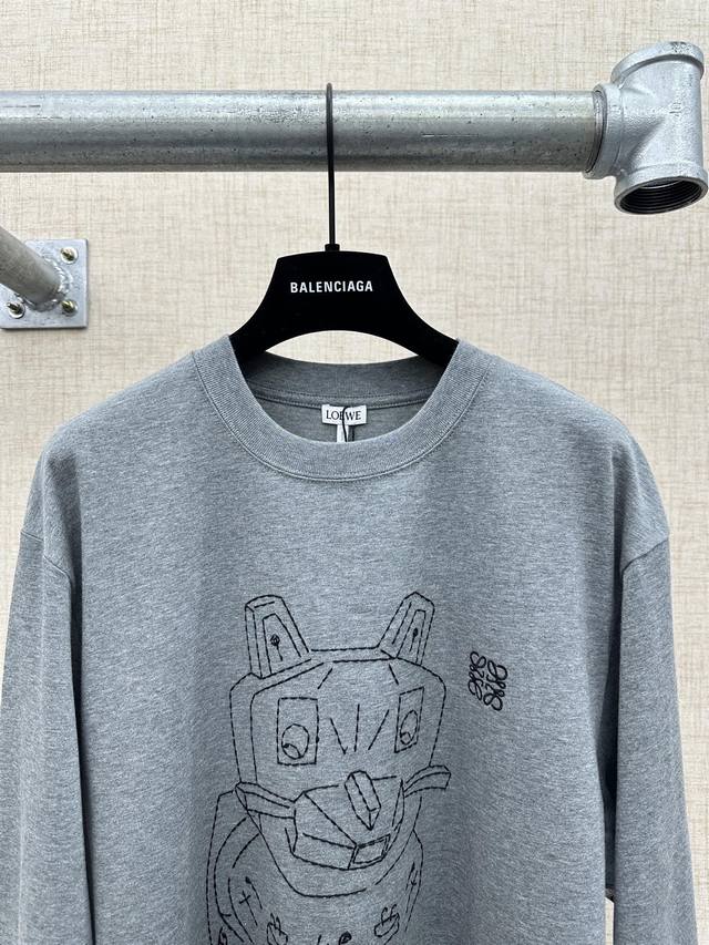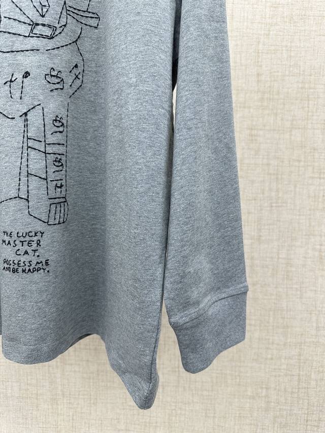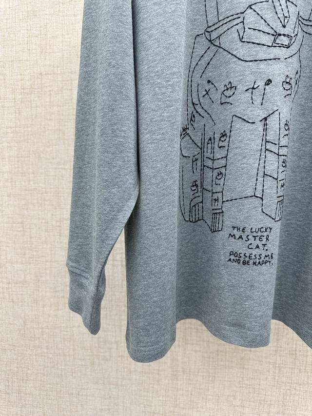 Loewe Cotton Lucky Cat Embroidered Long-Sleeve T-Shirt (DDD) 2026 Spring/Summer Collection New Long-Sleeve T-Shirt. The front features an abstract line drawing of the "Lucky Cat" embroidered with the English phrase "The Lucky Master Cat, possess Me And Be Happy." The right side features Loewe's classic Anagram logo embroidery. The T-shirt has an oversized, relaxed silhouette with dropped shoulders and long sleeves. It's 100% cotton, except for the embroidered details. The fabric is a lightweight cotton knit. The back is simple. The lucky cat design is inspired by artist Louis Wain's "Futurist Cats" ceramic vase series. Sizes: S, M, D