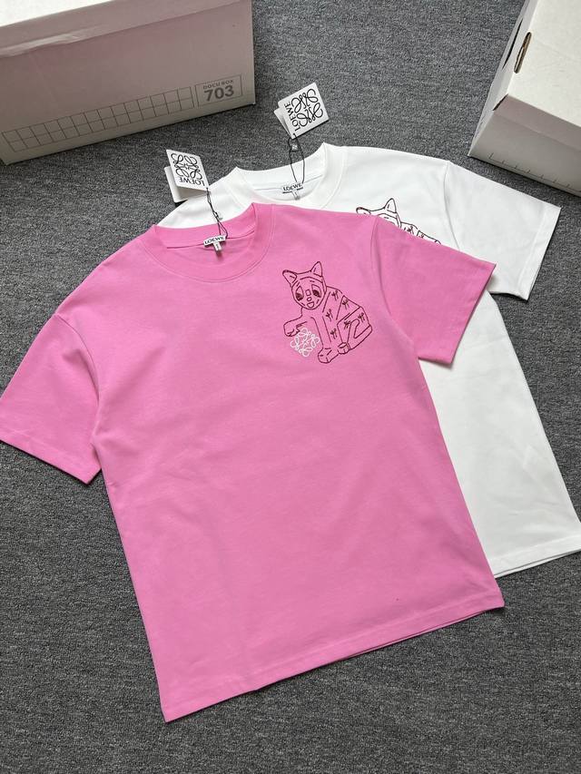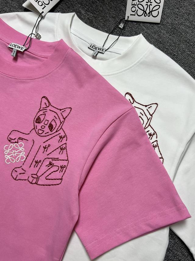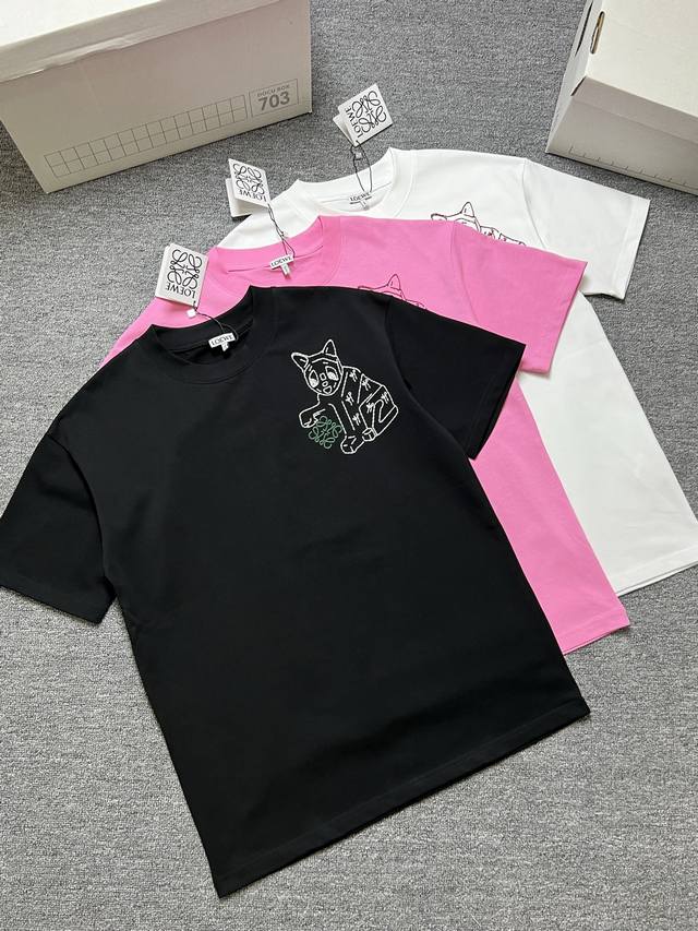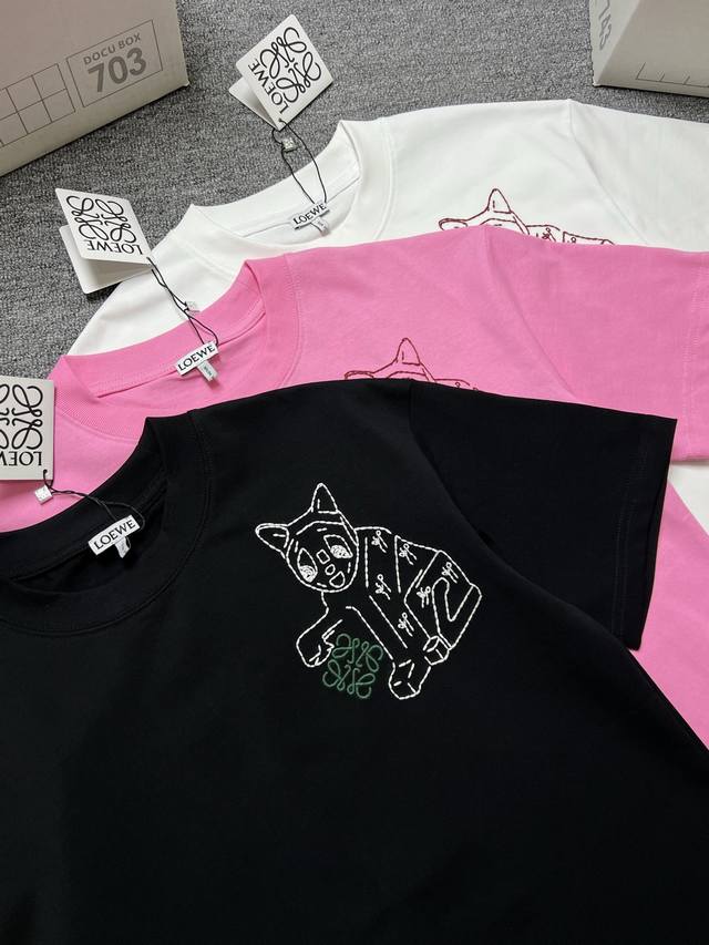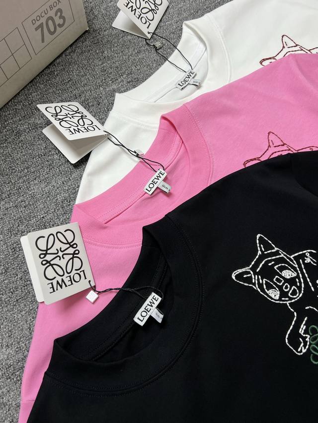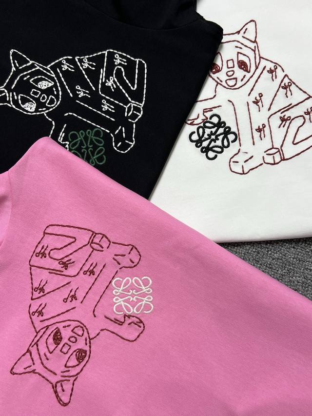 Loewe Short-Sleeve T-Shirt Colors: Black, White, Pink Sizes: S-XL Craftsmanship: Cat embroidery on the chest Fabric: 300g