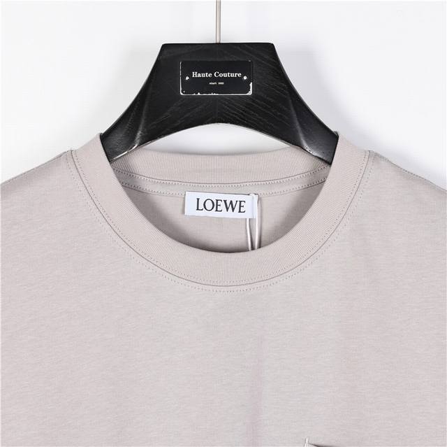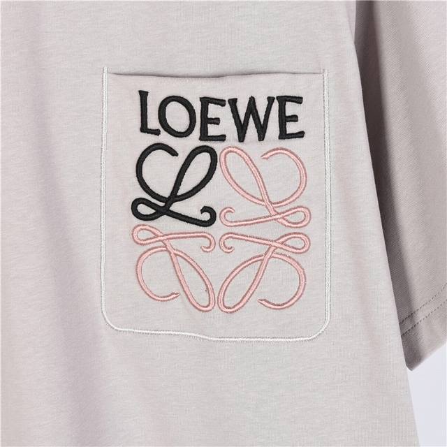 Loewe short-sleeved T-shirt with contrasting logo embroidery on the pocket. This simple, fresh style exudes a refined elegance. Made from 260g combed cotton, this fabric is thick, soft, and skin-friendly. The soft, delicate feel is breathable and comfortable, with an impeccable texture. The contrasting logo embroidery on the chest pocket creates a luxurious and elegant look for both men and women. Available in white, black, and gray. Sizes: S-Xl.