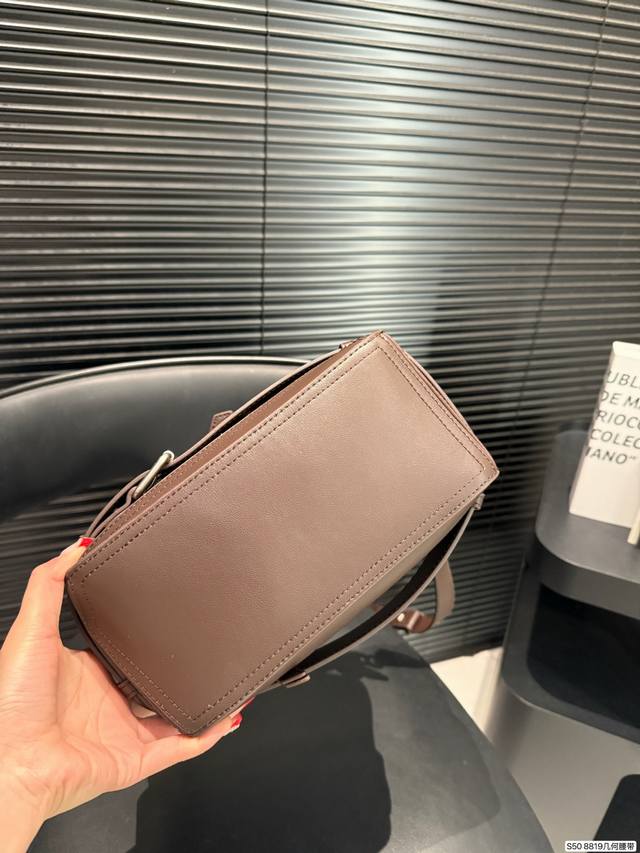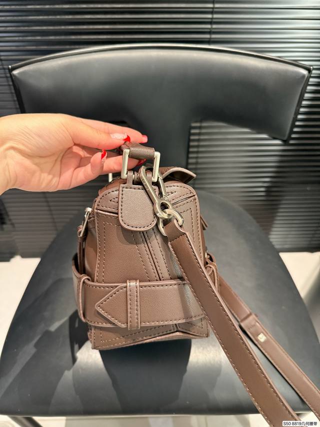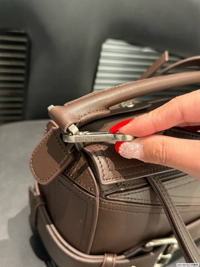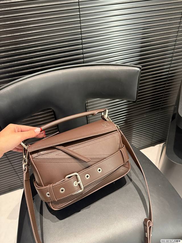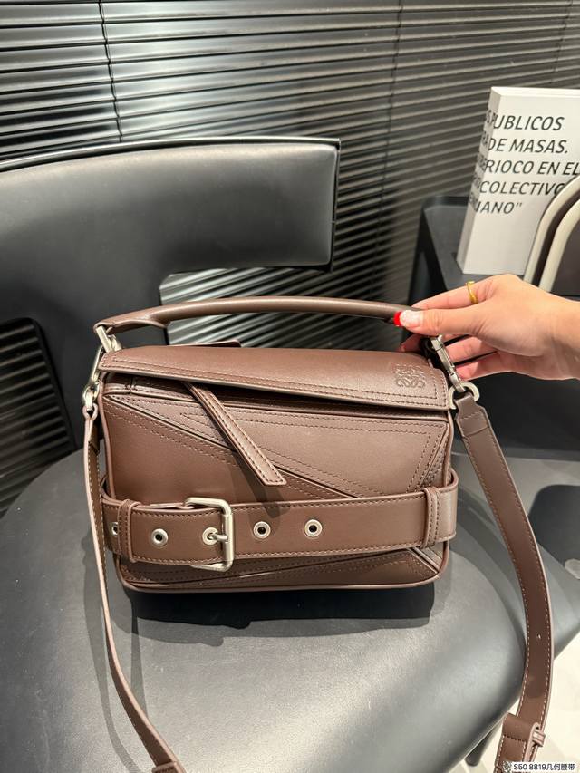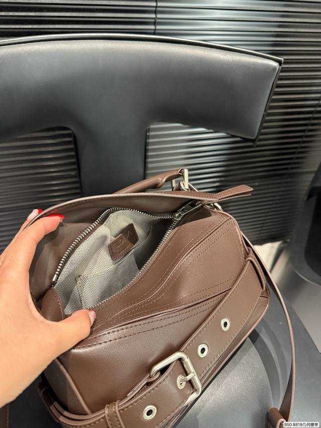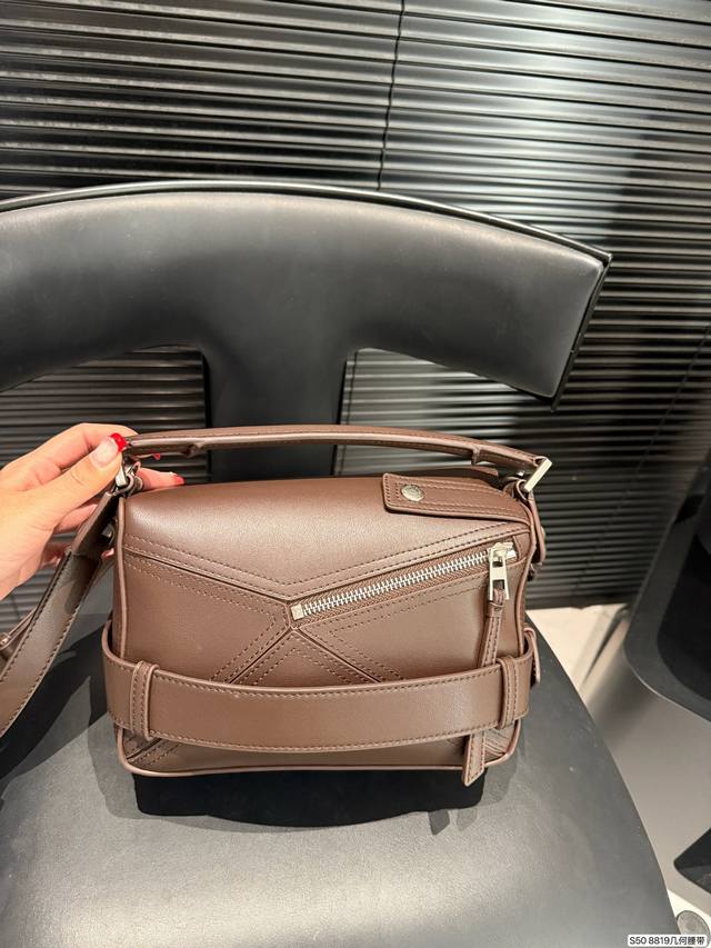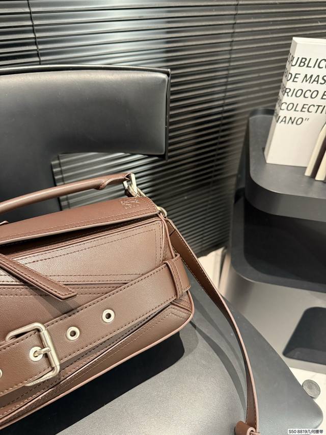 Loewe's coolest bag, the Puzzle Biker. Loewe's new motorcycle-inspired bag for this year, echoing the 10th anniversary edition of the Puzzle. The decorative strap and brooch design, combined with retro silver hardware details, give the bag a super cool look. Made of specially developed precious leather, the bag is foldable and leaves no marks. The glossy calfskin material has a delicate sheen, showcasing the geometric design beauty of the Puzzle. Sizes 24-15. Item number 8819. Geometric belt.