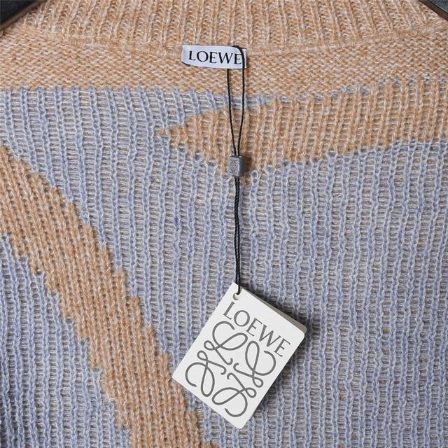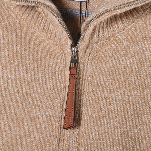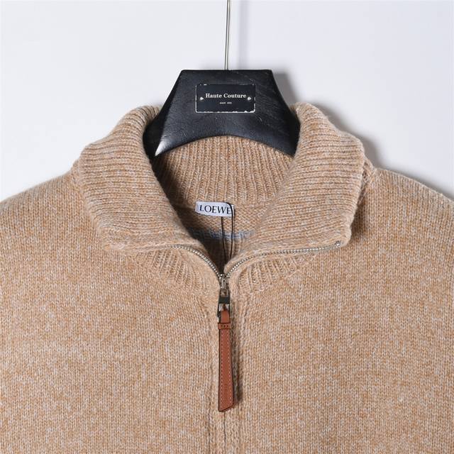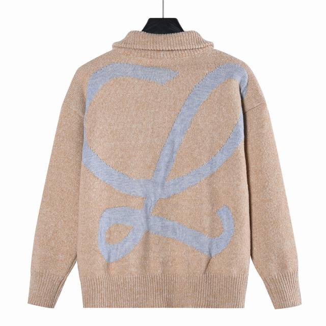 Lowew Loewe logo jacquard wool blend turtleneck zip-up cardigan. The Ddd cardigan embodies a relaxed yet iconic aesthetic, using texture as its narrative and symbols as its sharp edge. It's a modern interpretation of "understated luxury." The fabric is crafted from select wool blend yarns, with a speckled texture reminiscent of caramelized sand, offering a soft, plush feel while maintaining a structured silhouette thanks to its dense knit. The turtleneck zip-up design allows for both open and closed styles, providing warmth in cold weather and creating a cozy ambiance in warmer conditions. Worn alone, it exudes a relaxed chic vibe; layered underneath, it's a timeless and versatile piece for your autumn/winter wardrobe. The Ddd logo features the iconic Anagram interwoven lettering on the back, presented in a three-dimensional flocked finish. The fluffy texture of the fleece contrasts visually with the dense knit, while the light blue and off-white color scheme clashes with the caramel base, creating a gentle yet powerful effect. The Ddd logo is eye-catching yet understated, elevating this basic jacket to a modern, artistic level. The Ddd oversized, dropped-shoulder design flatters various body types, offering a relaxed and effortless look for both men and women. A full zip creates a sleek turtleneck, while a half-zip creates a casual lapel, unlocking multiple styling options