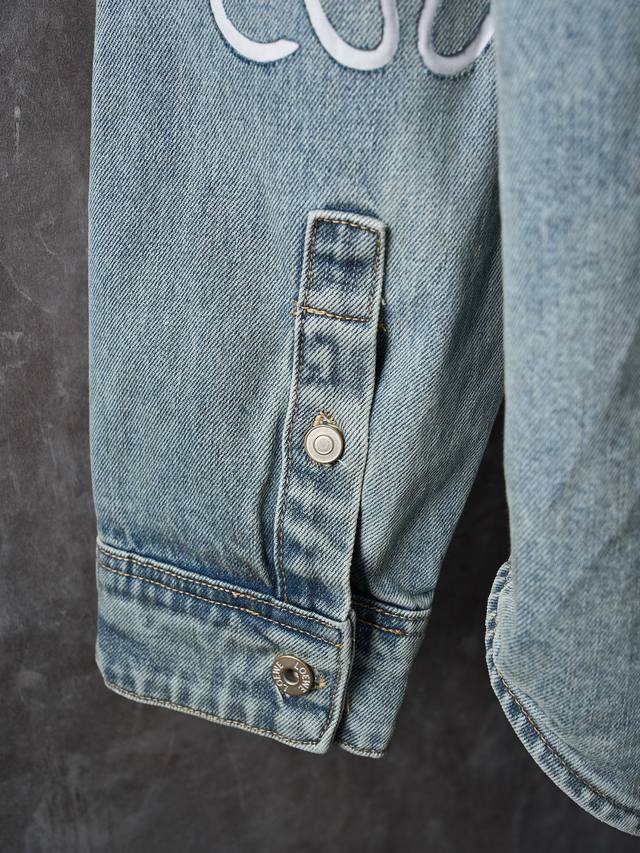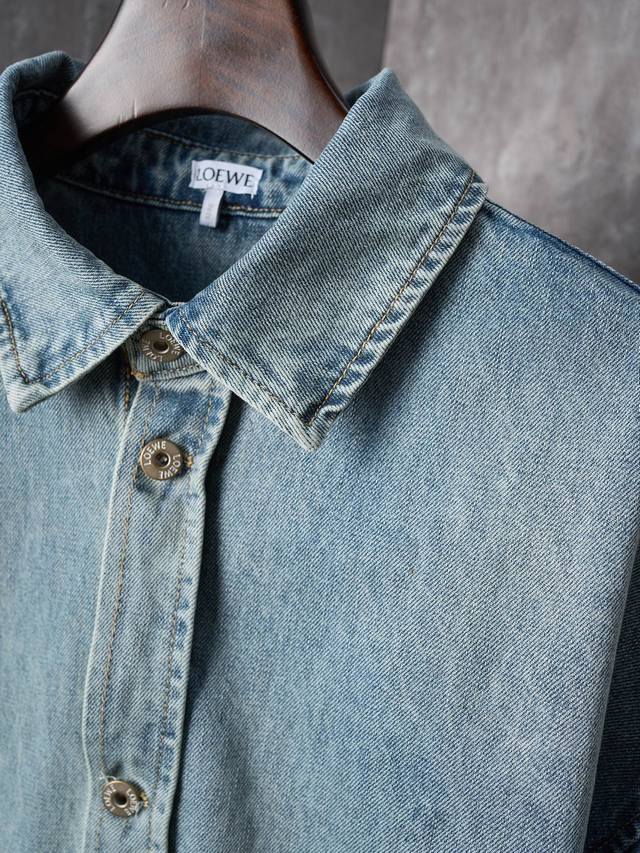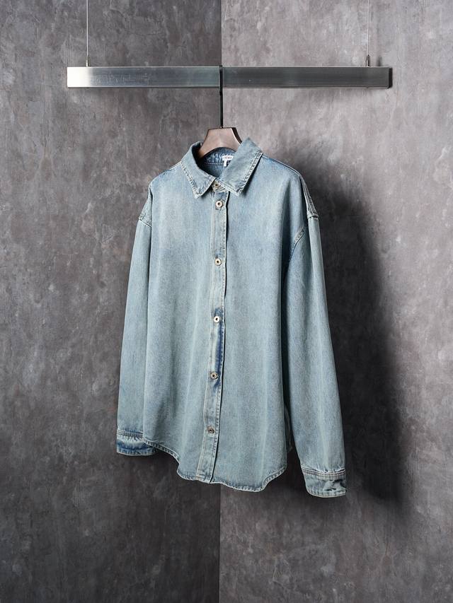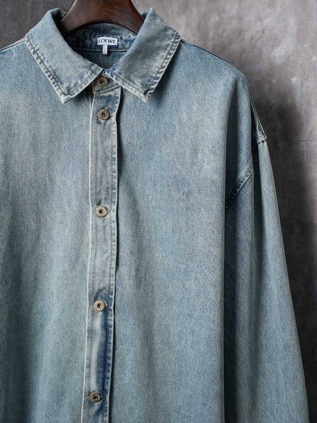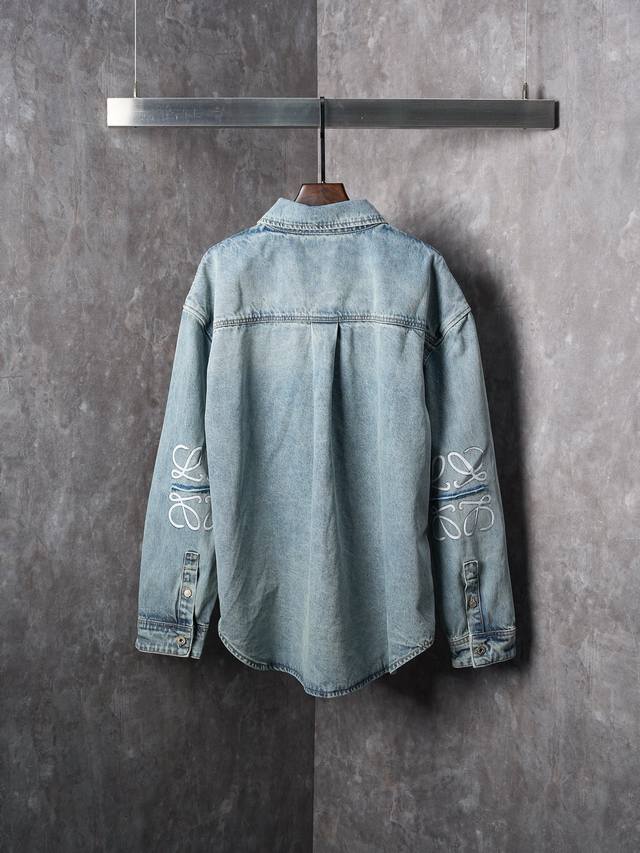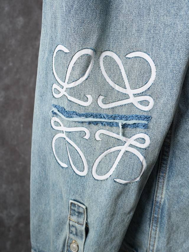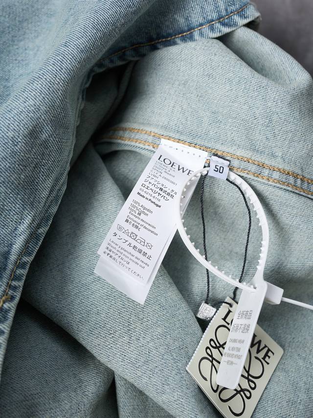 Real item hanging photo: Loewe laser-burnout lapel long-sleeved denim jacket. Sizes 46, 48, 50, and 52 are in stock. Authentic product purchased for 11,900 RMB. Made with custom-dyed 12*12 denim fabric, finished garment washed and faded, laser-burnout, artificial monkey pattern, custom 1:1 replica buttons, custom 1:1 replica label, loose fit.