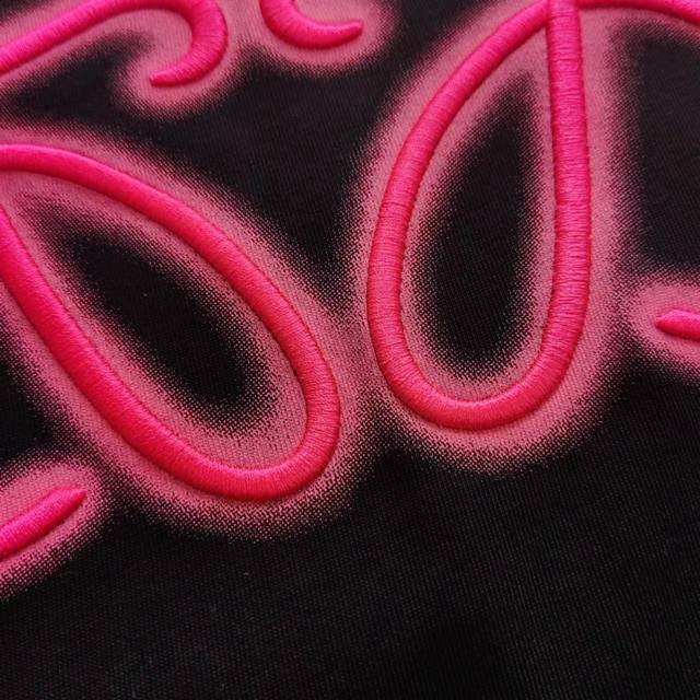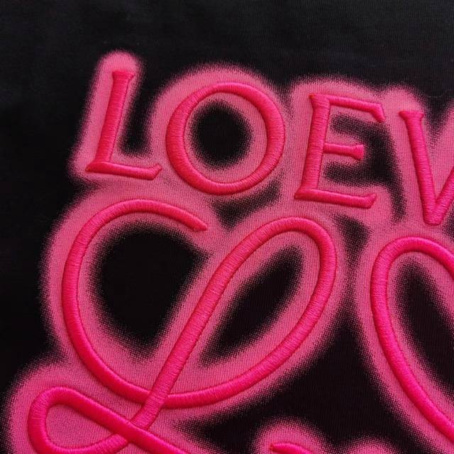 Real shot details + size chart. Loewe neon embroidered fluorescent pink short-sleeved T-shirt. The logo has been exquisitely upgraded, inspired by 80s retro style. Made with original fabric, the same style as the official product. Custom-made 280g same-dye fabric, very comfortable to the touch. New spring/summer style, fashionable and unique, super versatile and good-looking. Suitable for both men and women, a must-have. All tags, labels, and washing instructions are complete. Colors: White, Red, Black/Red. Sizes: S-XL.