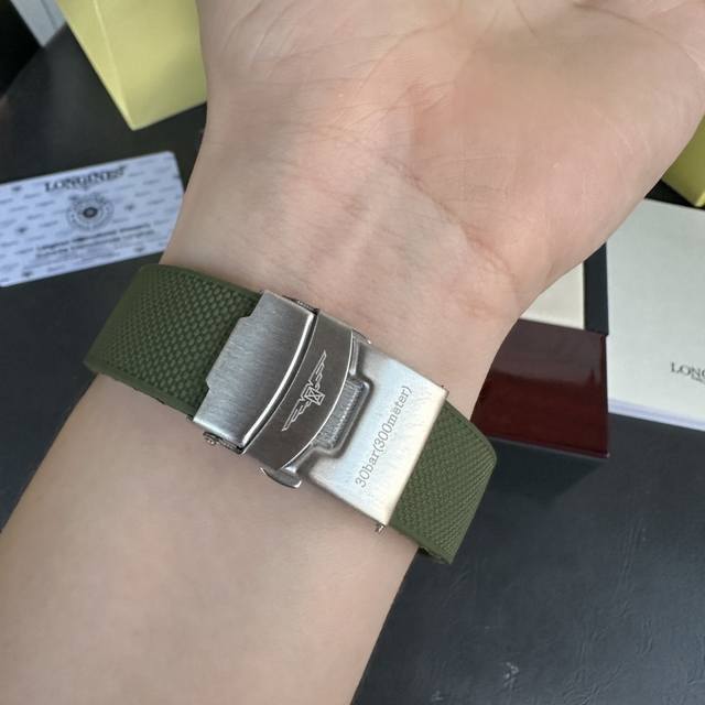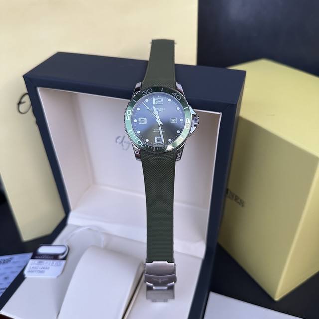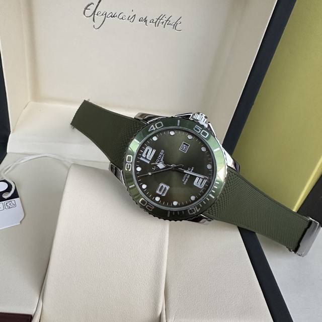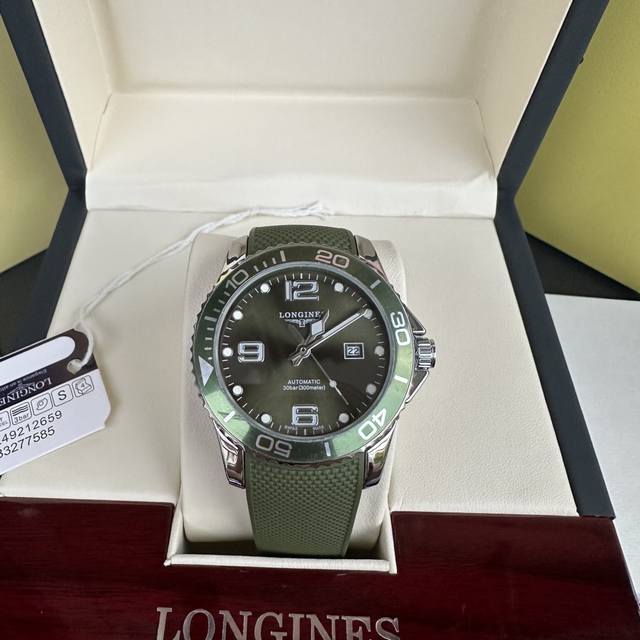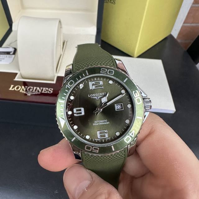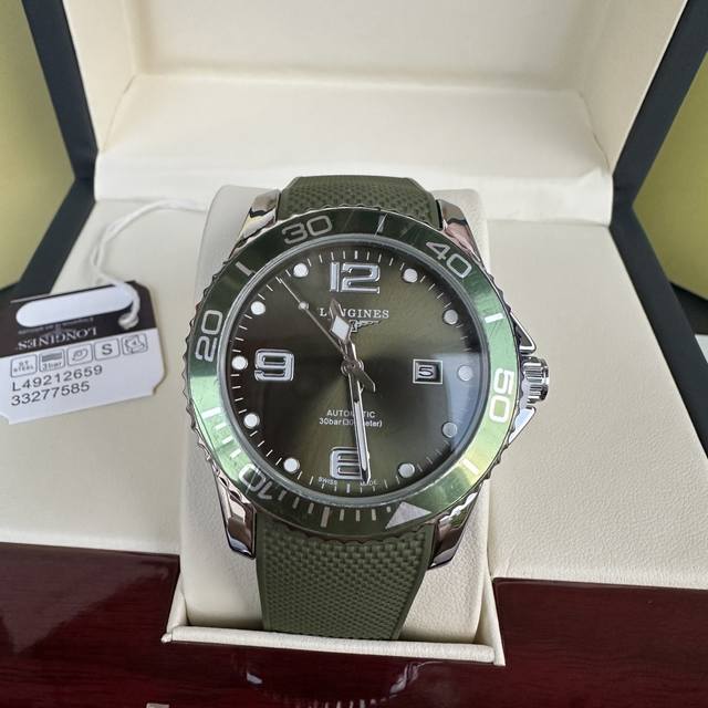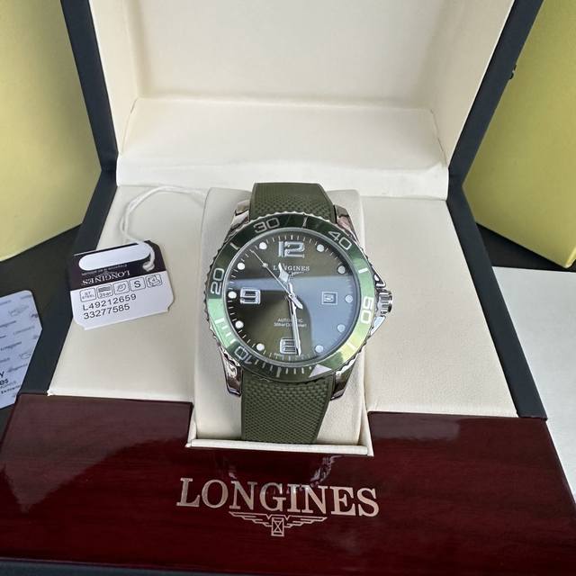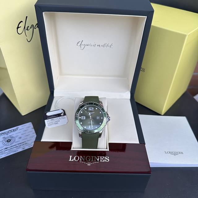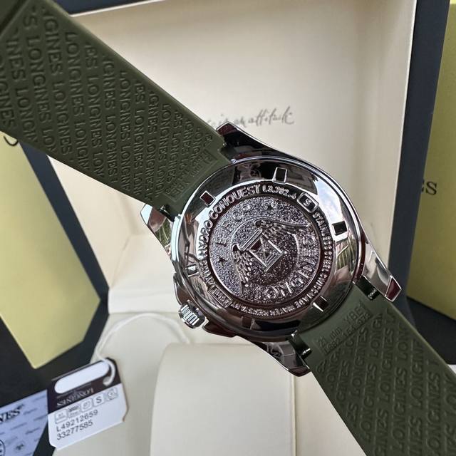 Longines Conquest olive green men's quartz watch, Longines Conquest military green tape watch, comes with a full gift box. The dial is 42mm with a rotating bezel. The stainless steel case is flawless and meticulously polished, continuing the tradition of meticulous quality. The imported rubber strap features a fully automatic imported quartz movement for precise timekeeping.