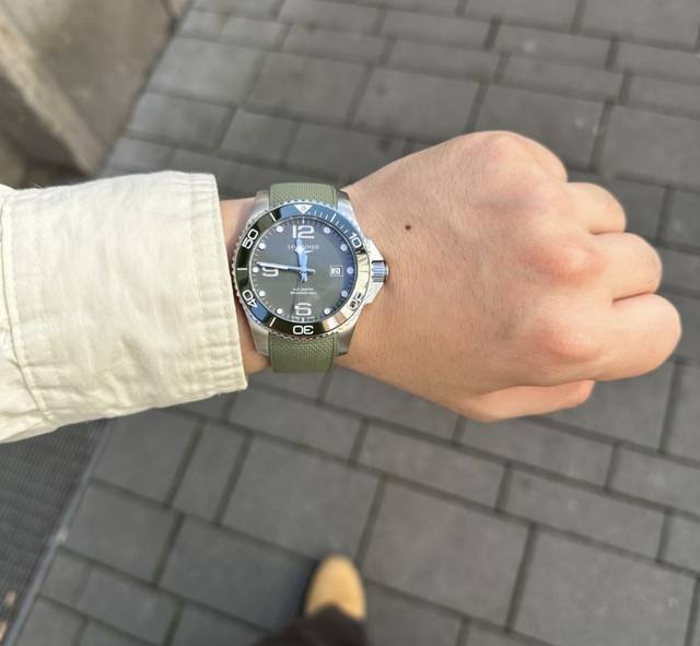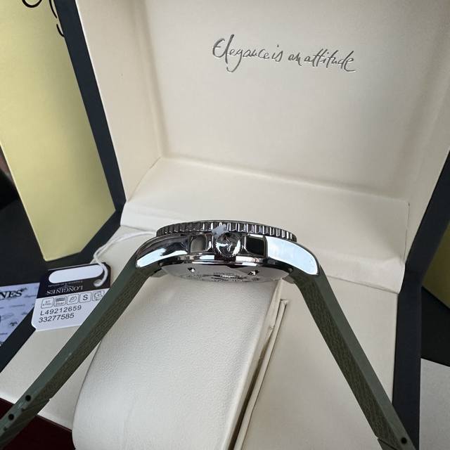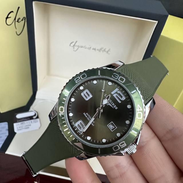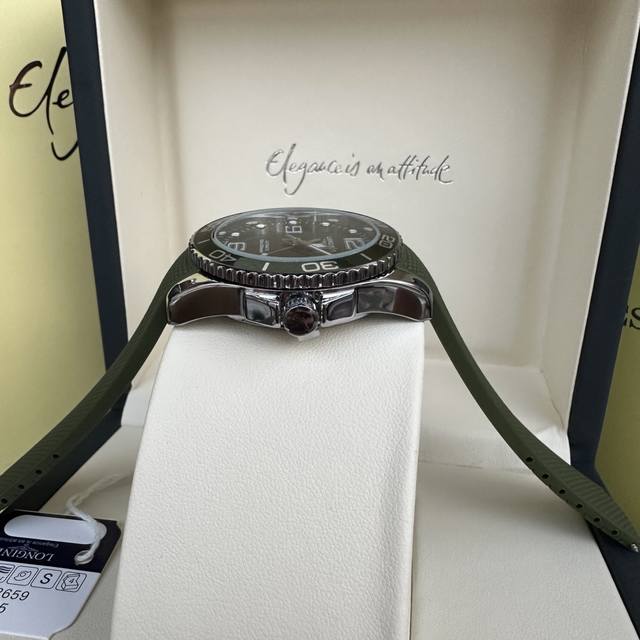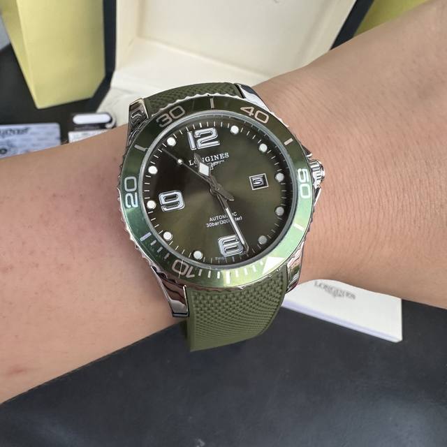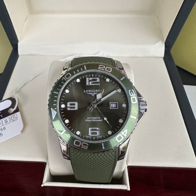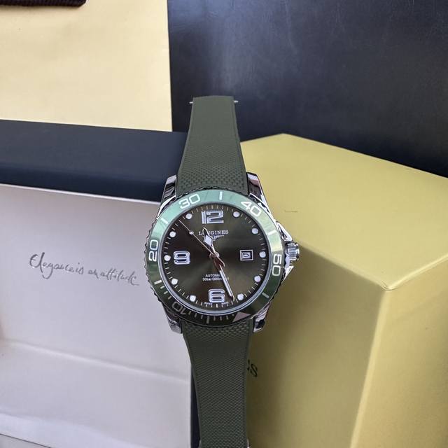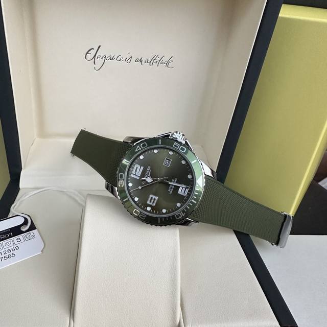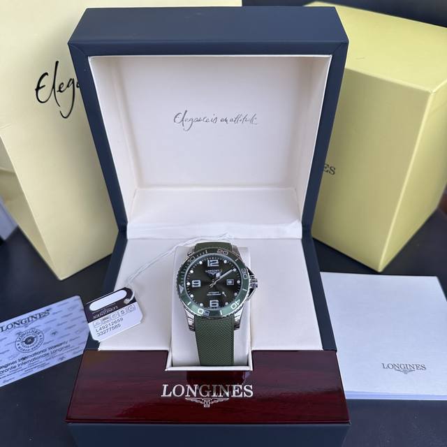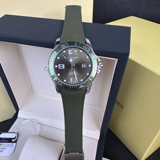 Longines Conquest olive green men's quartz watch, Longines Conquest military green tape watch, comes with a full gift box. The dial is 42mm with a rotating bezel. The stainless steel case is flawless and meticulously polished, continuing the tradition of meticulous quality. The imported rubber strap features a fully automatic imported quartz movement for precise timekeeping.