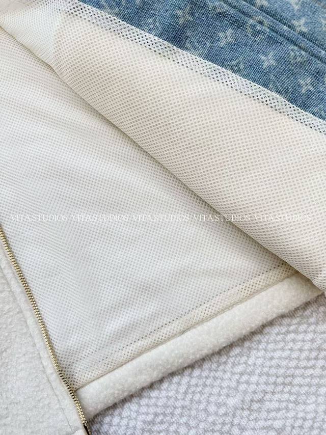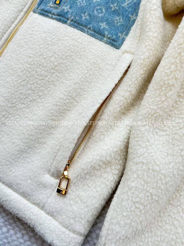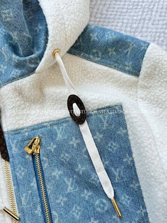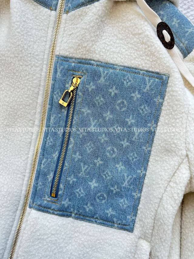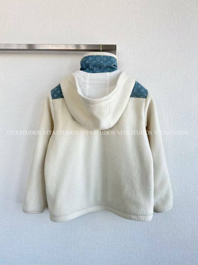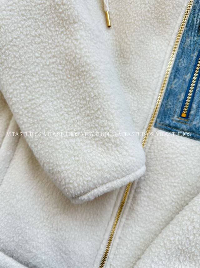 Hot Item Pre-order DDD Lambswool Patchwork Jacket DDD Made of wool and polyester blend fabric DDD Wool gives the jacket a soft, skin-friendly, and warm texture DDD Polyester enhances its abrasion resistance and wrinkle resistance DDD Allowing the lambswool's fluffiness to be maintained for a long time DDD Partial patchwork of denim jacquard fabric, the denim blue and lambswool white create a strong visual contrast DDD The lining is made of mesh material to improve breathability DDD The hood has a padded interior and the drawstring is freely adjustable, balancing warmth and style DDD The denim fabric on the front is strictly made according to the pattern DDD The front and center placket features a brand-customized metal zipper DDD The front pocket uses denim printed fabric as a zippered patch pocket, the pocket shape is three-dimensional and echoes the overall style DDD The front zippered pocket has a custom metal zipper pull DDD Color: White DDD Size: SML DDD Lv*Wt DDD