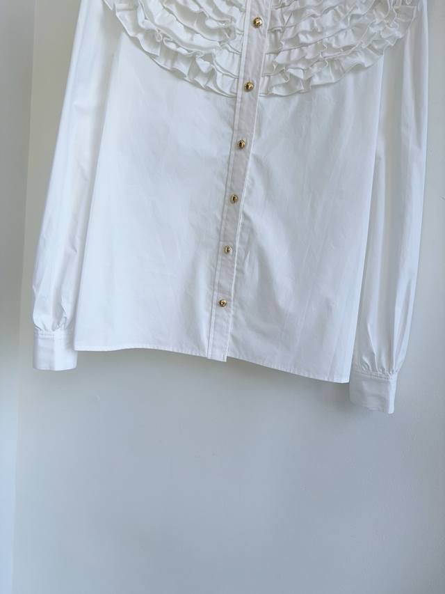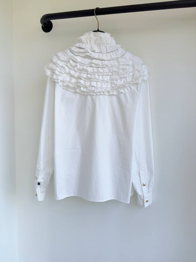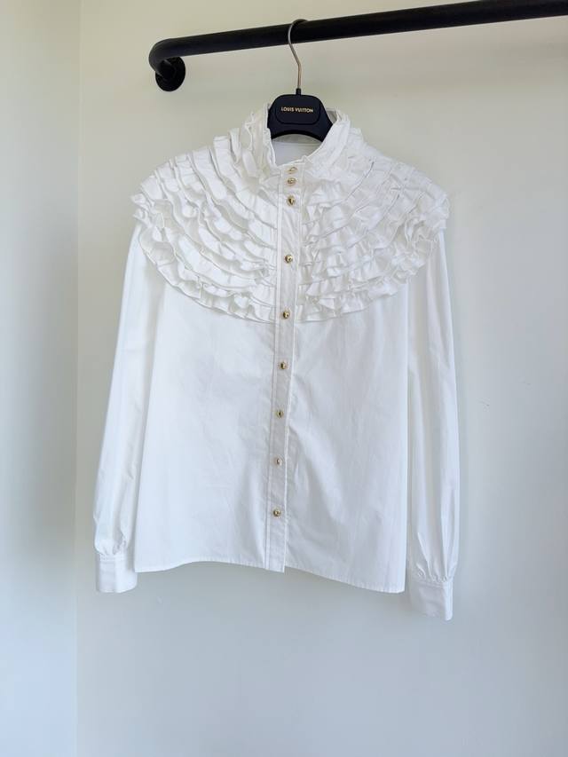 Loui25's new fall ruffled collar shirt is shipping. This shirt is crafted from cotton poplin in a classic straight silhouette. Ruffles accent the chest, shoulders, and stand-up collar, creating a romantic volume that complements the gathered cuffs. Metal buttons add the finishing touch. SML