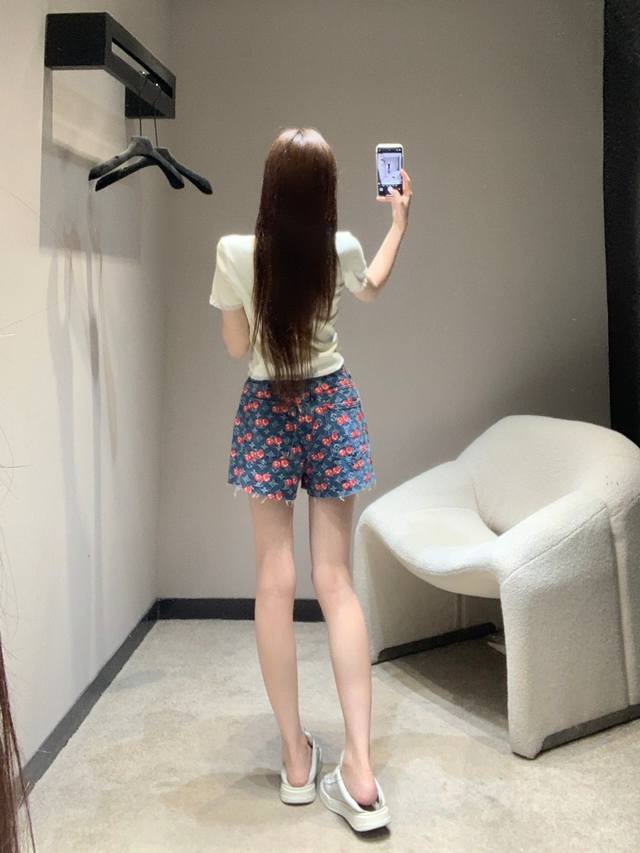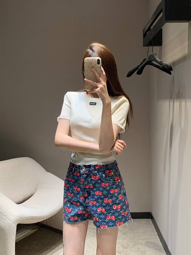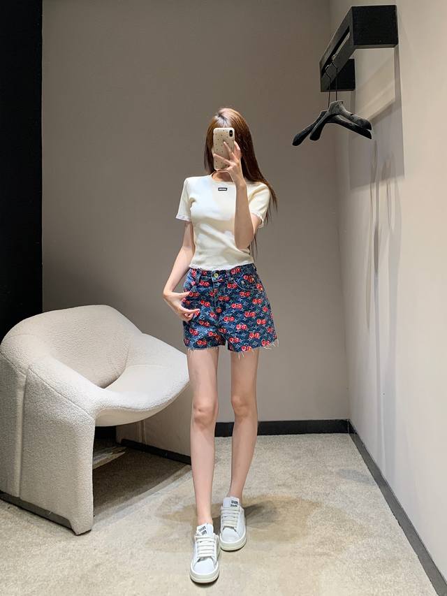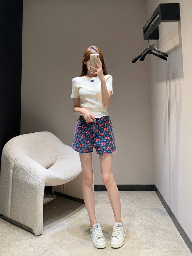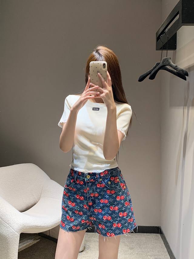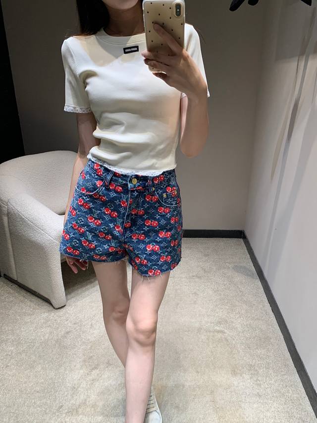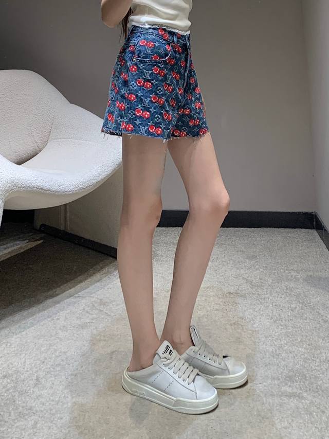 Louis Vuitt*N 25Fw Early Autumn New Style Cherry Full Printed Denim Shorts | Exclusive High Edition! Cotton denim material, enzyme washing process, not easy to fade, cherry letter full print design highlights the brand tone, symmetrical pockets, good-looking and slim, overall fashionable and stylish! Available now SML