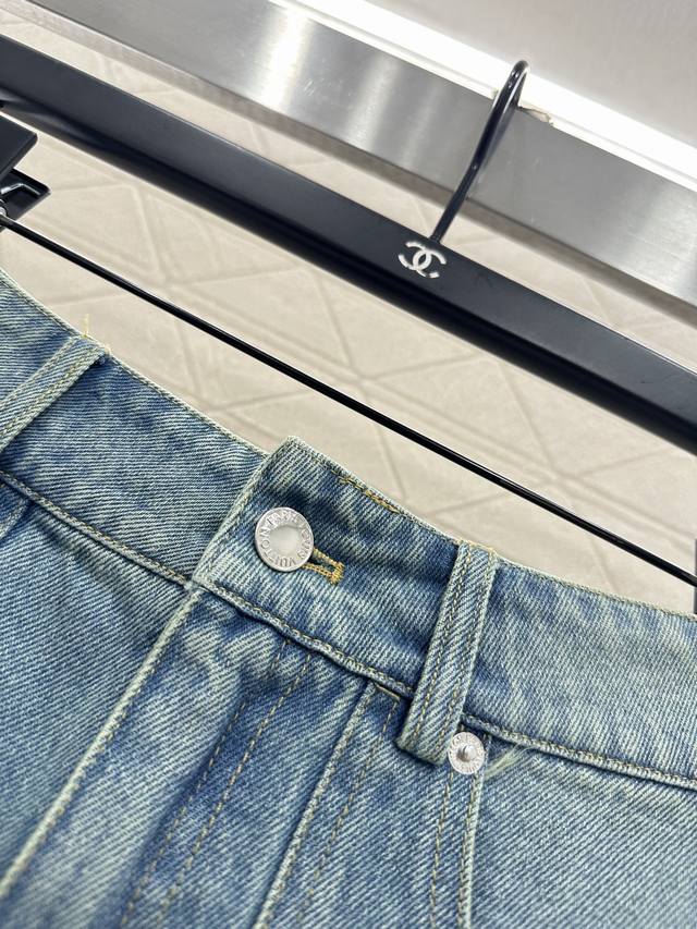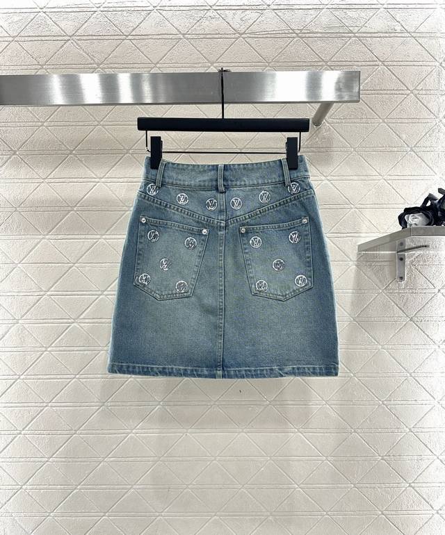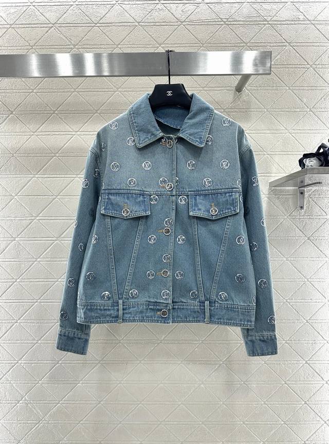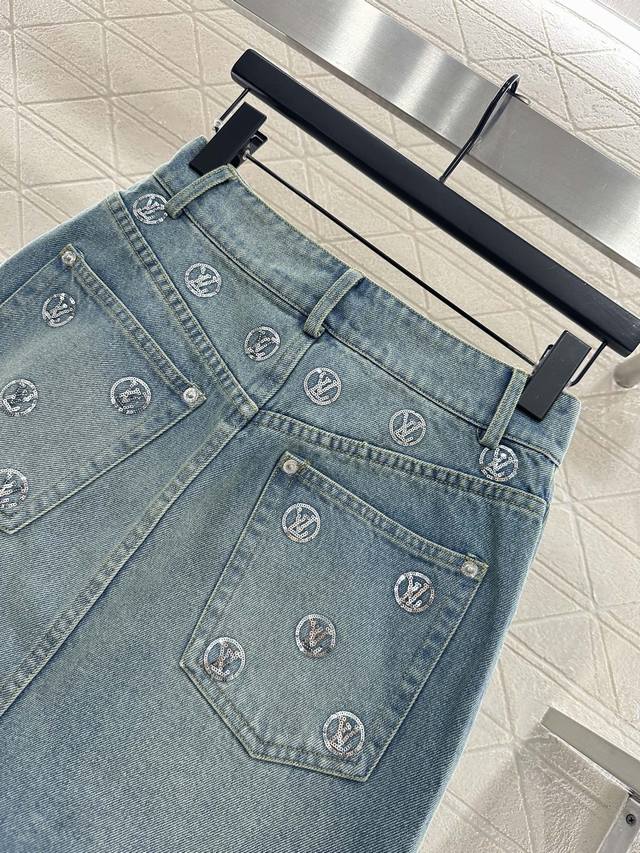 Custom Yb twill cotton denim, multiple washes for a crisp texture, lapel and structured denim jacket cut, flap pockets with sequined LV logo, timeless and sophisticated style, echoing the pocket logo and front button, creating a retro and effortlessly chic unisex style. Paired with a matching straight skirt, the sequin details echo the unified style, making it stylish and eye-catching whether worn as a set or alone, suitable for all seasons. Custom fabric and accessories, look for the high-quality version of the skirt.