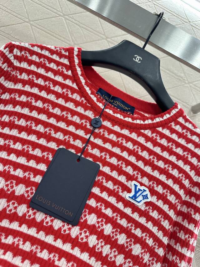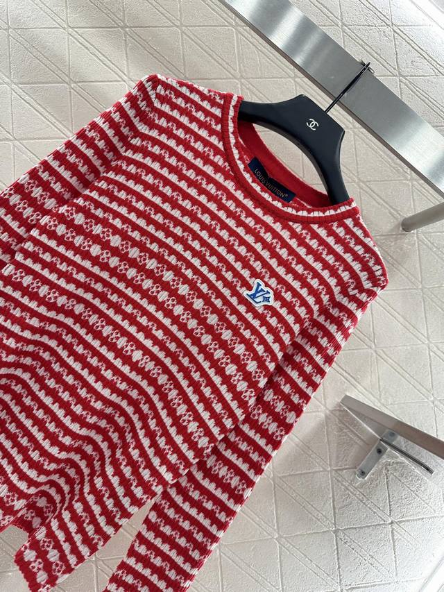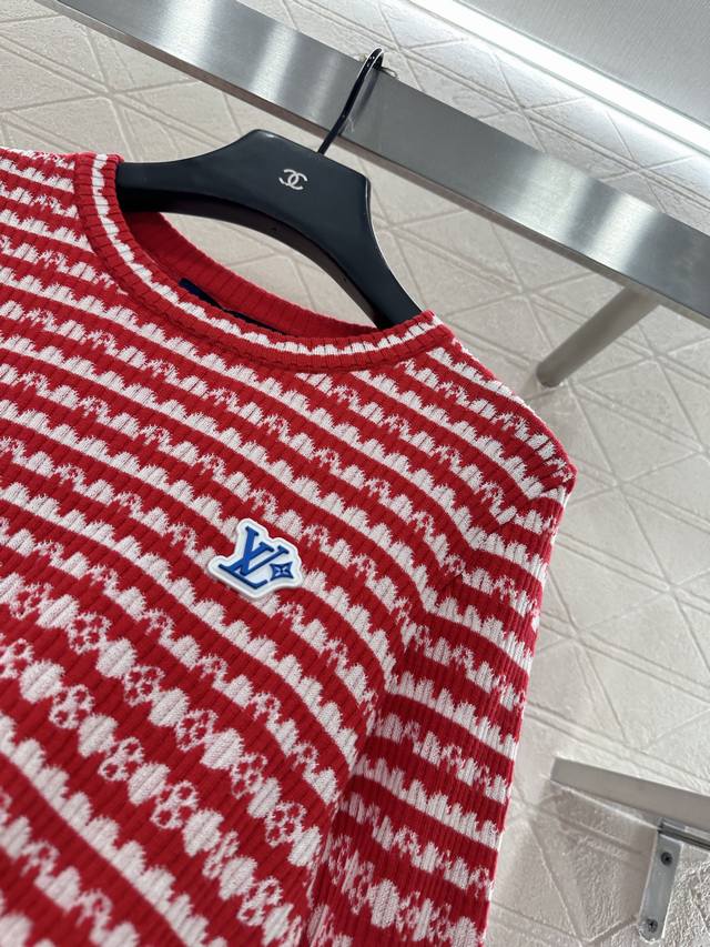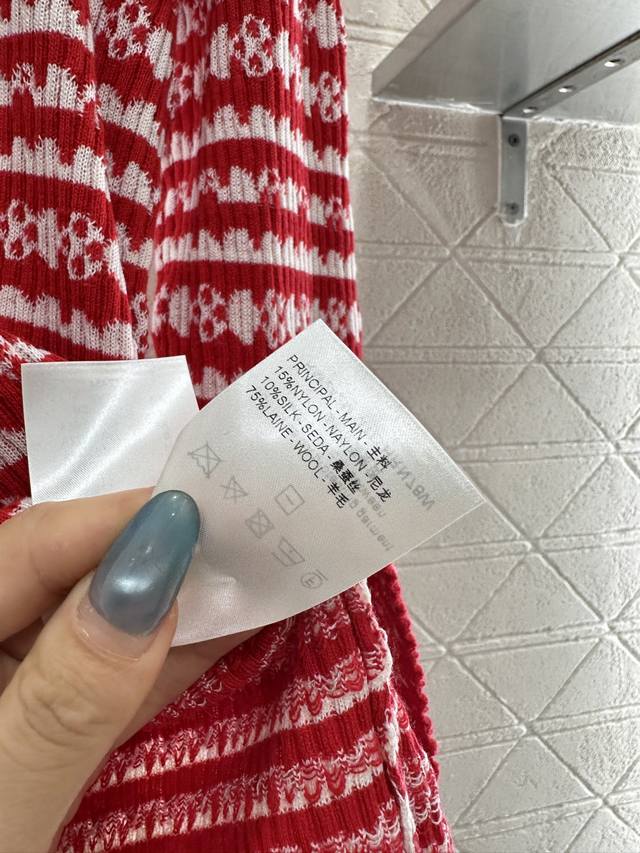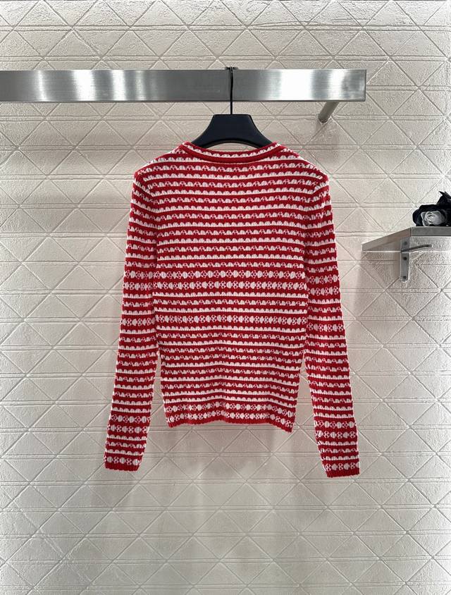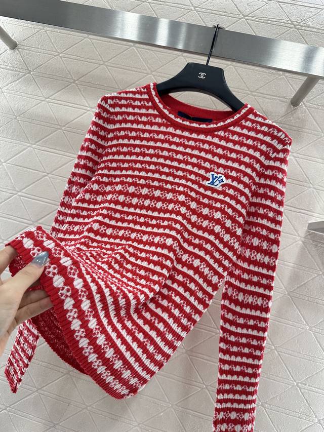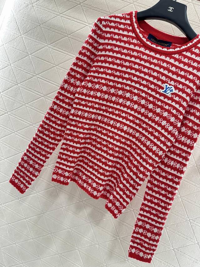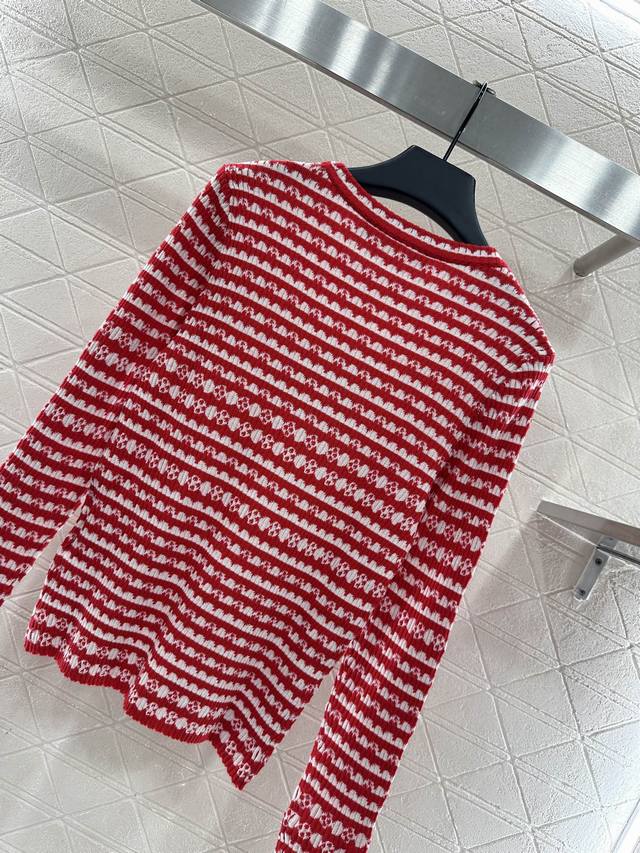Made with custom Yb silk and wool yarn, the fabric has a delicate texture and is comfortable to wear. The pullover long-sleeve design is stretchy, slimming, and flattering. The ribbed trim throughout, paired with a wave pattern on the collar, echoes the two-tone alternating stripes. The blue letter logo and four-leaf clover embroidery on the chest add a touch of sophistication and visual richness. Perfect for everyday wear or parties. Custom fabrics and accessories, high-quality version, 2 colors