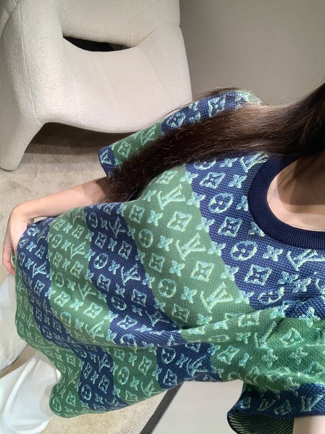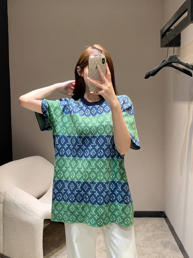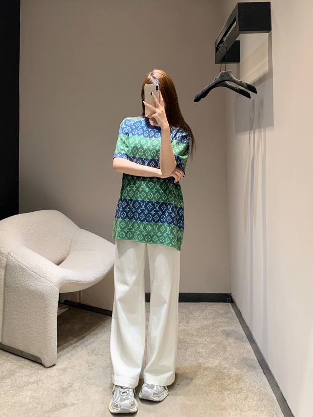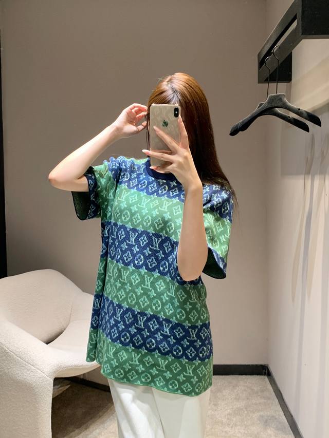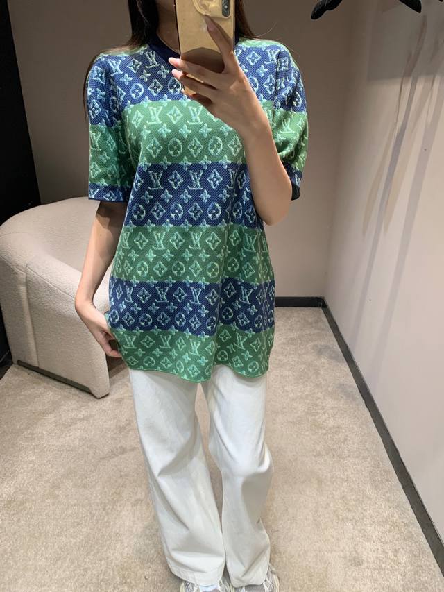Louis Vuitto* 25Fw Early Fall New Monogram Striped Short-Sleeved Crewneck T-Shirt | Exclusive Yb Development! High-Quality Edition! Unisex style features a three-dimensional jacquard pattern with alternating dark blue and emerald green stripes, breaking up the monogram's dullness. The dropped shoulders and slightly loose fit create a flattering silhouette. Wear it alone for a comfortable fit in early fall, or layer it as an inner layer for a layered look. Perfect for both practicality and aesthetics. Available now in sizes S, M, L, and