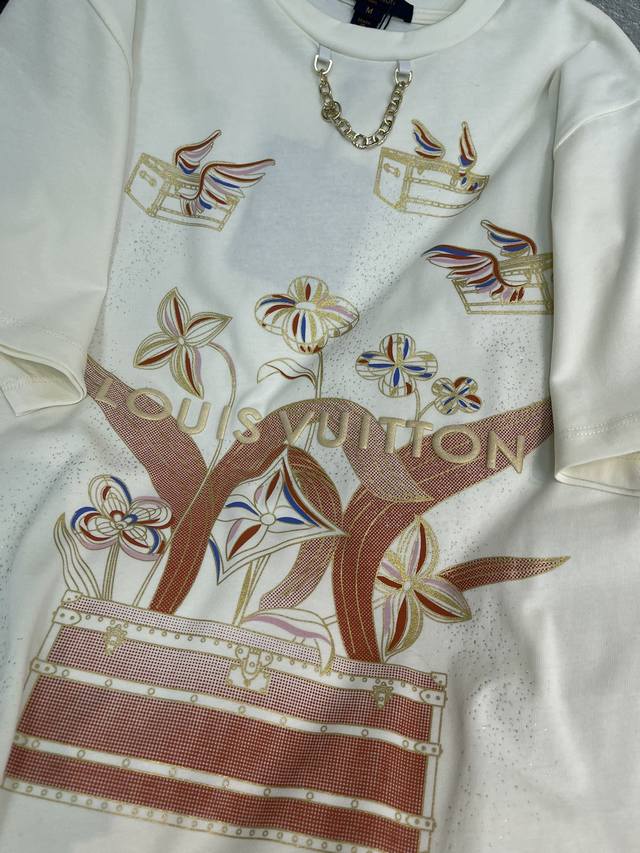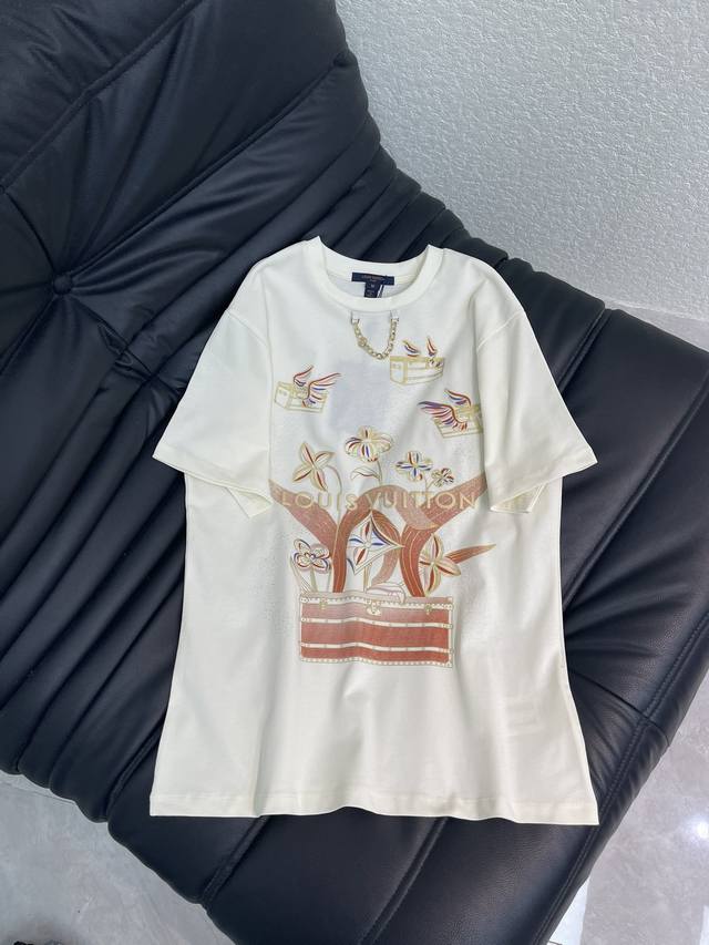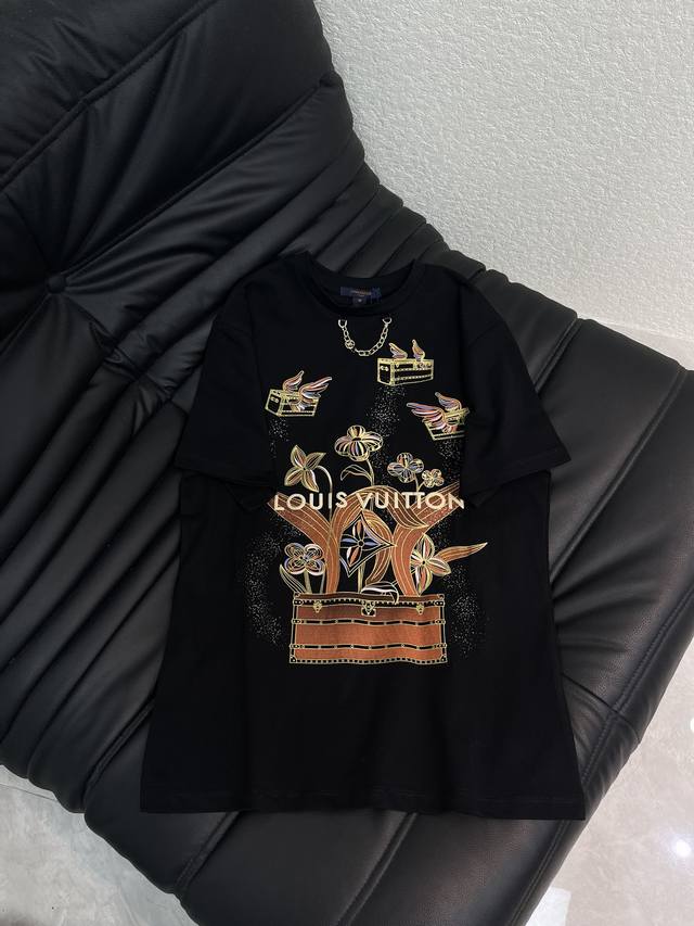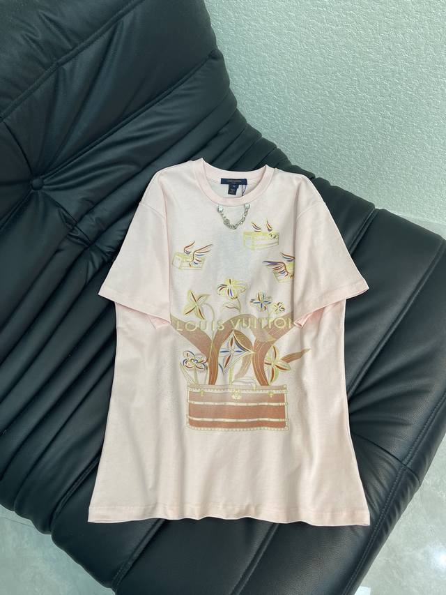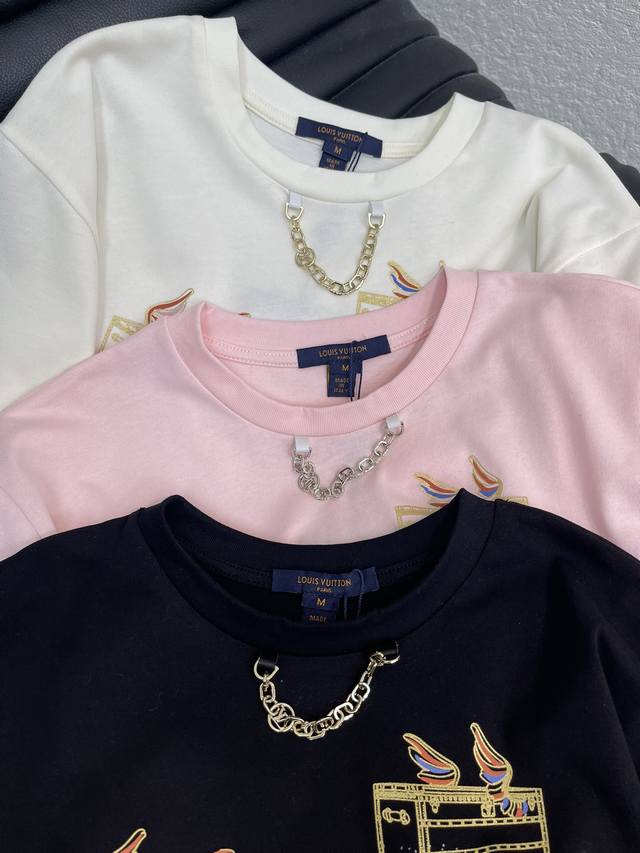 Louis Vuitto* Crew Neck Logo Print Ddd Custom Yb Twill Cotton, delicate texture, comfortable and breathable, regular short-sleeved cut, highlighting the brand's style. Made of 100% cotton, slightly stretchy, creating a slimming visual effect. The neckline is adorned with a letter chain, and the chest features a color-reproduced four-leaf clover pattern resembling a bag, with a bubble process highlighting the letter logo, echoing the brand's style. The artistic style is rich and layered, fashionable and casual, and looks great worn alone or as an inner layer. Custom fabrics and accessories, look for the high-quality version. 3 colors: black, white, pink Aa. DDD