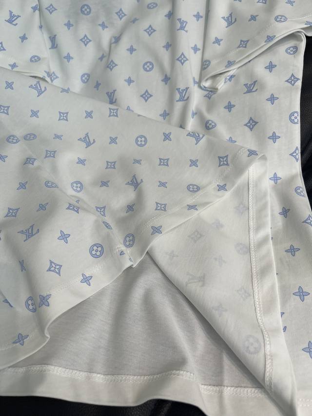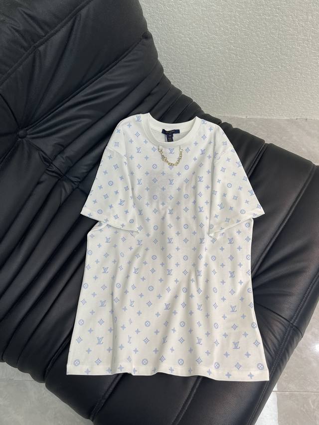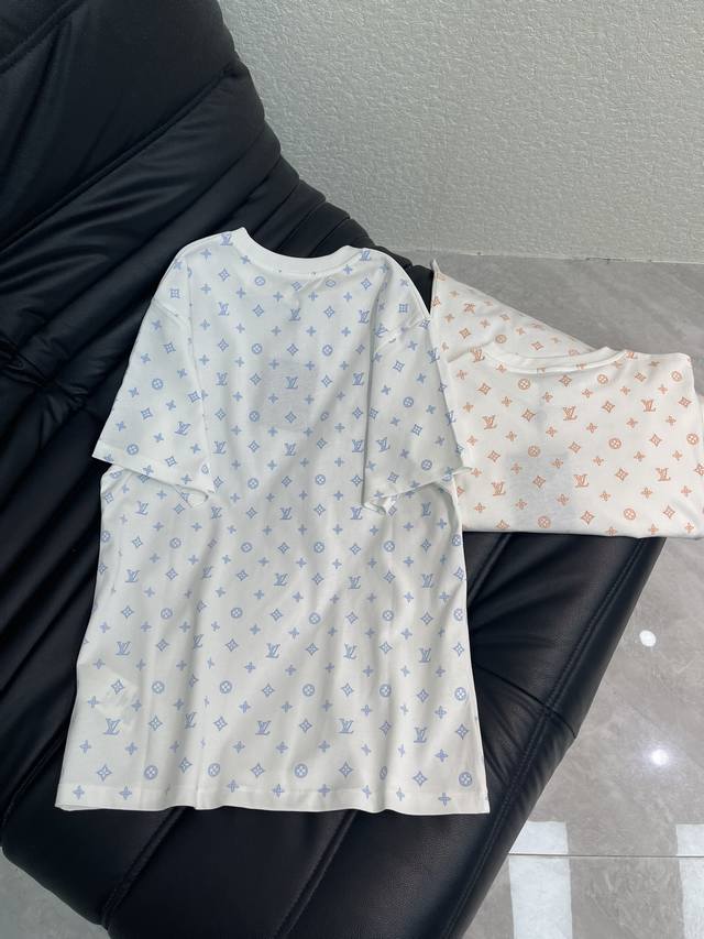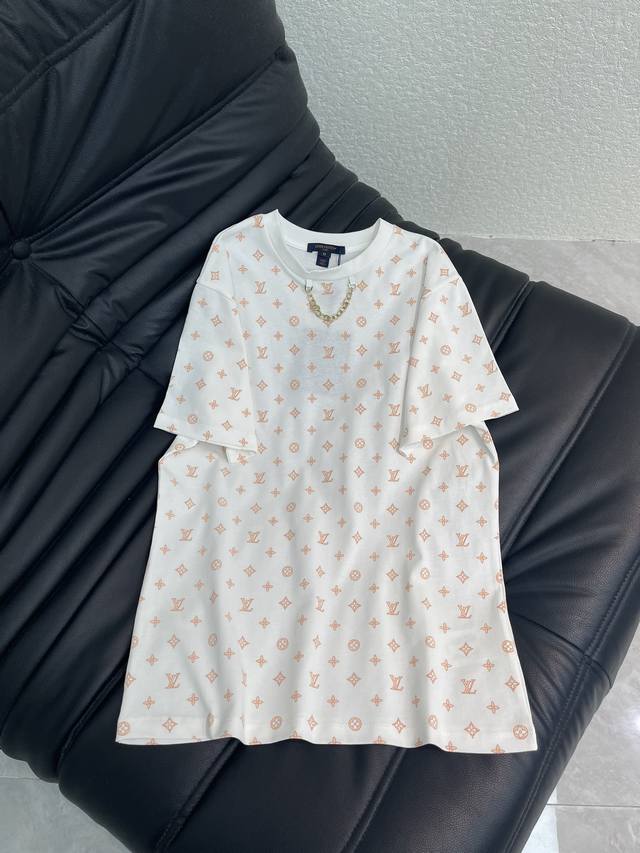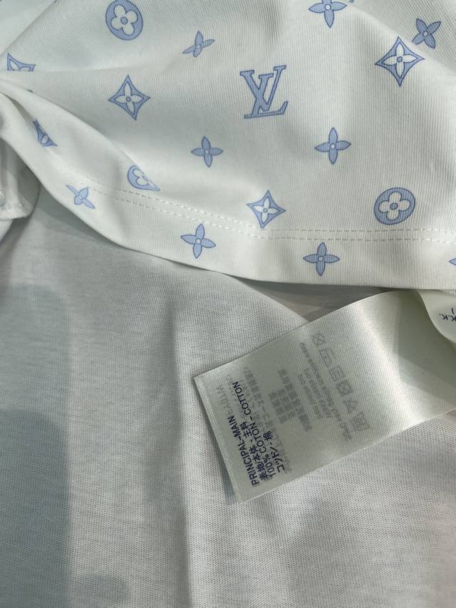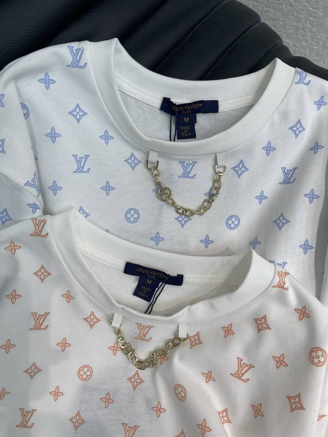 Louis Vuitto Spring/Summer 2026 New Crew Neck Printed Chain Short-Sleeve T-Shirt. Made from custom Yb mercerized cotton, breathable, comfortable, and with a premium feel. The regular short-sleeve cut highlights the brand's style. Made from high-quality cotton with a slight stretch, it creates a slimming effect. The neckline features a metal letter logo chain with white ribbed trim. The entire body is printed with four-leaf clover letters. Available in white with coral orange or sky blue jacquard patterns, it exudes youthful energy and looks great worn alone or layered. Sml Aa. DDD