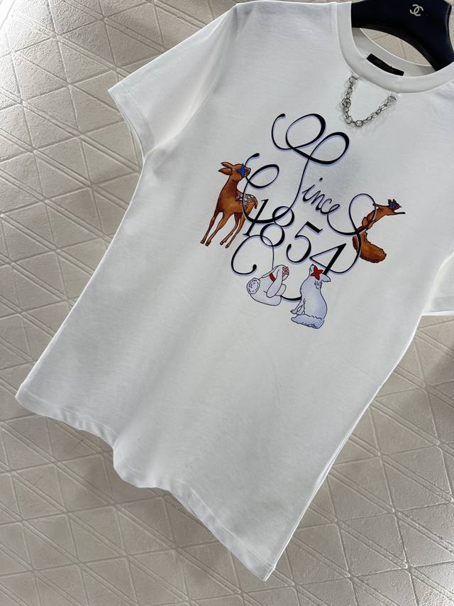 Louis Vuitto*2025 New Arrival DDD Crew Neck Cartoon Print DDD Custom Yb twill cotton, delicate texture, comfortable and breathable, loose short-sleeved cut, highlighting the brand style. Made of 100% cotton, slightly stretchy, creating a slimming visual effect. The neckline is adorned with a letter chain, and the chest features a colorful print of the animal logo in cursive script, echoing the brand style. The style is lively, playful, and layered, fashionable and casual, and looks great worn alone or as an inner layer. Custom fabrics and accessories, look for the high-quality version DDD