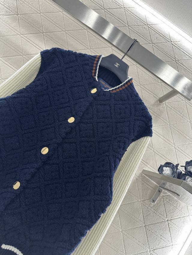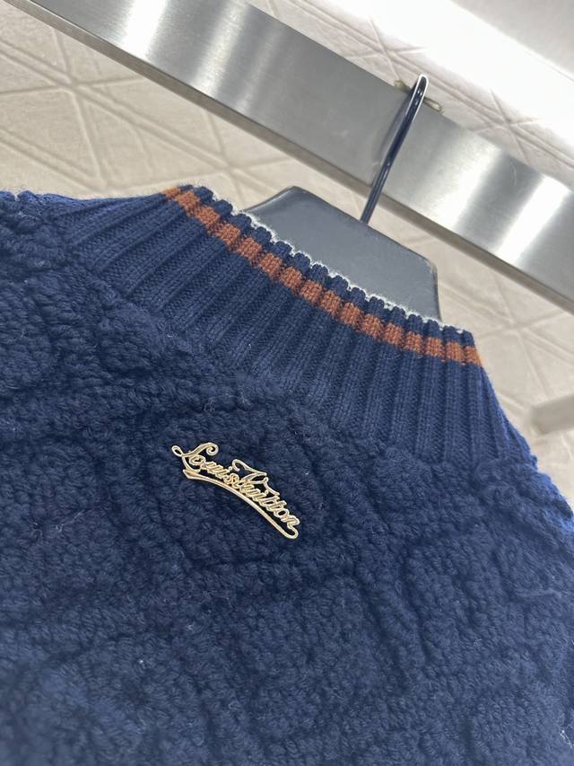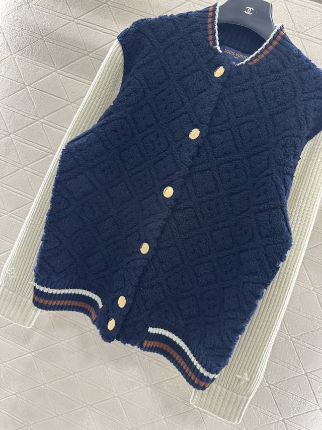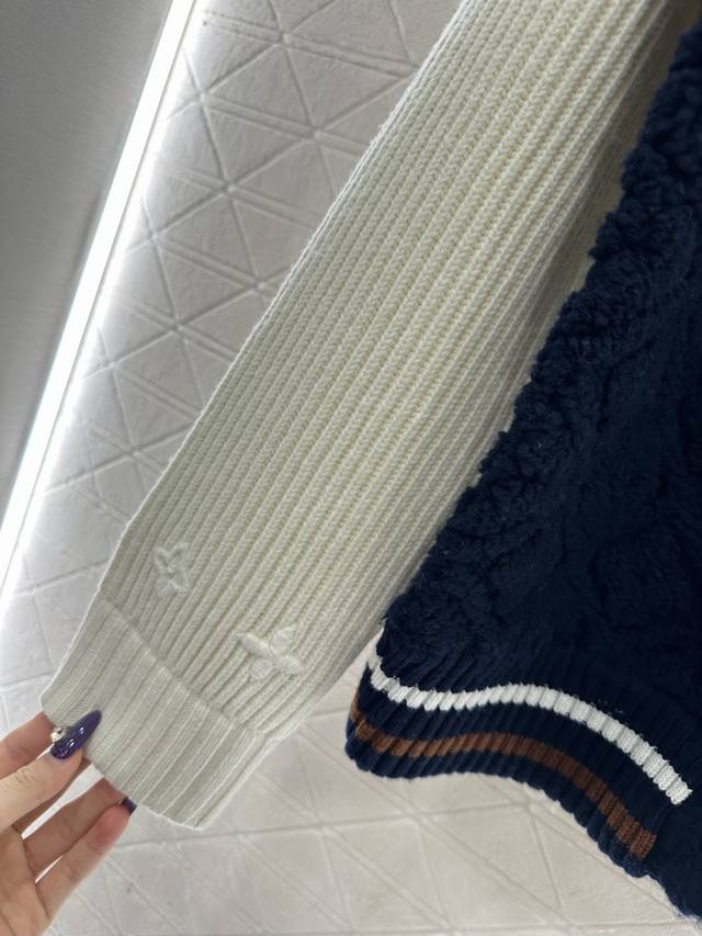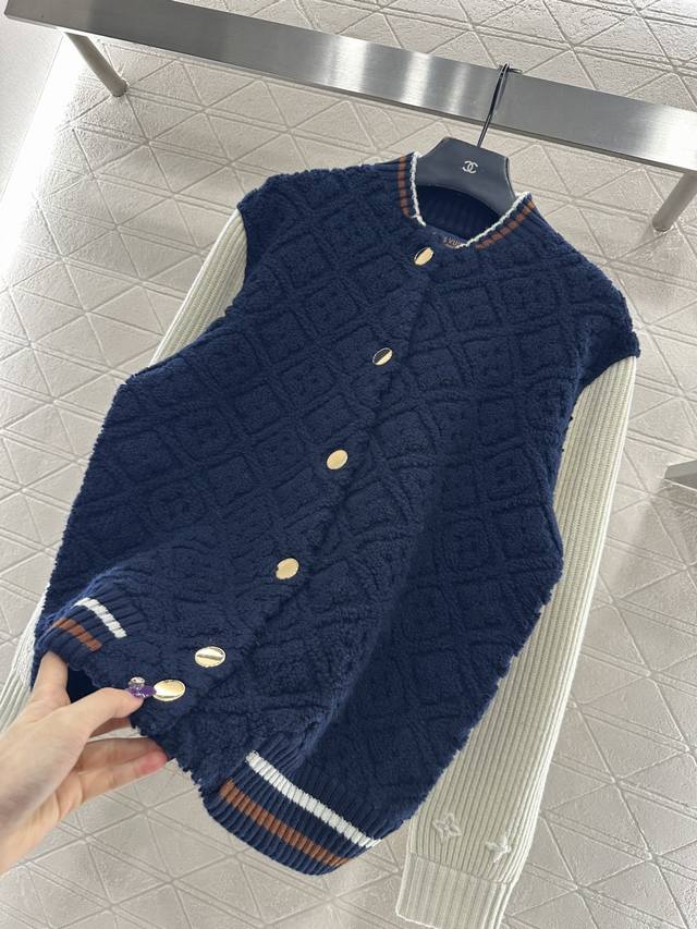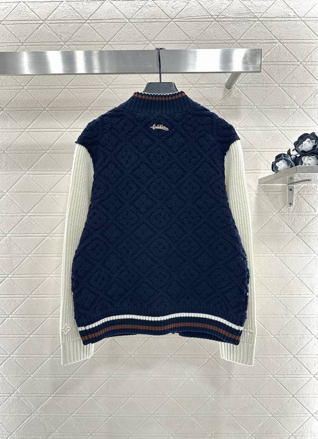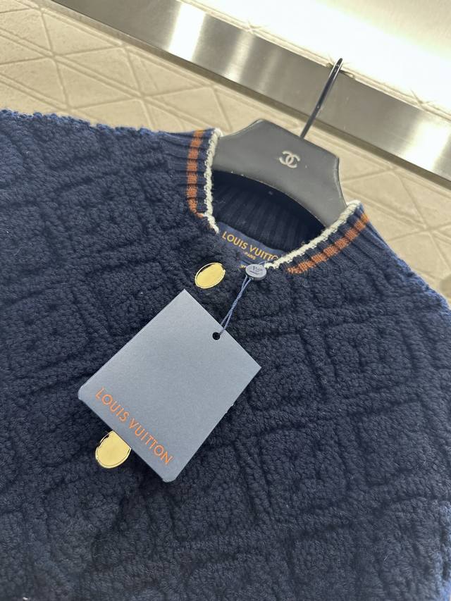 Louis Vuitto*2025 New Arrival DDD Jacquard Knit Color Block Jacket DDD Ski Collection# Custom Yb cashmere and wool yarn, jacquard finish for a three-dimensional texture, round neck baseball jacket style knit sweater, ready-made round button closure, hem and neckline echoing each other, navy blue jacquard all over the body, tapered with striped ribbed trim, white vertical ribbed trim on both sleeves, creating a double contrast of color and texture, logo on the cuffs echoes the back collar, highlighting style, overall high-end casual look, creating the brand's fashionable style. Custom fabric and accessories, look for the high-quality navy blue version. DDD