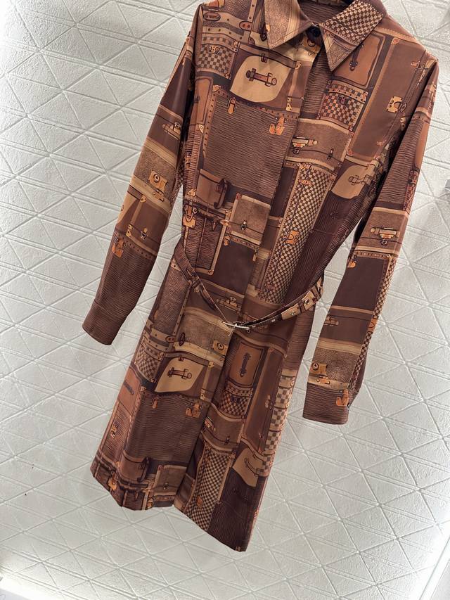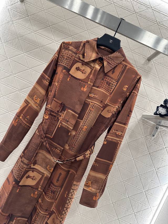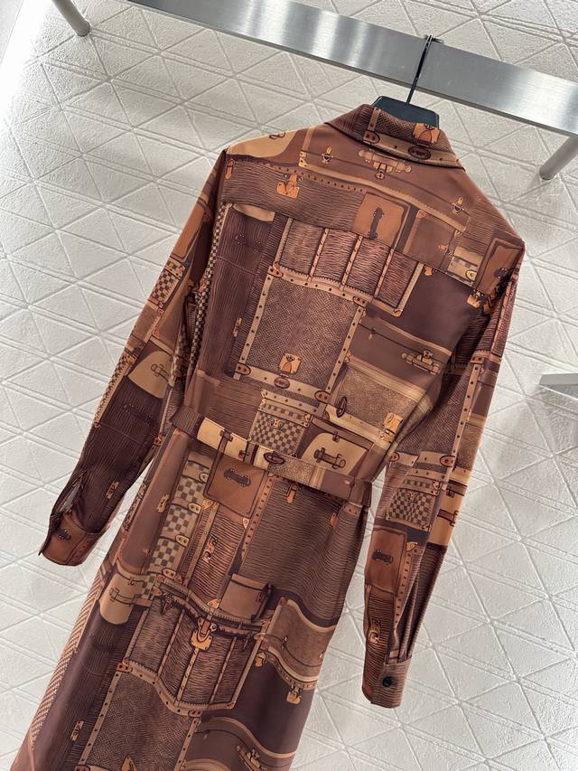 Louis Vuitto*2025 New Arrival Ddd Printed Belt Collar Shirt Dress Ddd Custom Yb Imported twill cotton, delicate texture, smooth drape and comfortable. The collared shirt dress features a predominantly light and dark brown color scheme, with printed patterns reminiscent of classic leather buckles and handbags, exuding a sophisticated and vintage feel. The dress utilizes tailoring and details to enhance its refinement. The concealed button closure and straight waistline create a natural drape, highlighting a relaxed and effortless style. A perforated belt cinches the waist for a slimming effect. Perfect for everyday wear, offering a sophisticated and relaxed look. Custom fabric and accessories, please ensure you choose the high-quality brown version. DDD