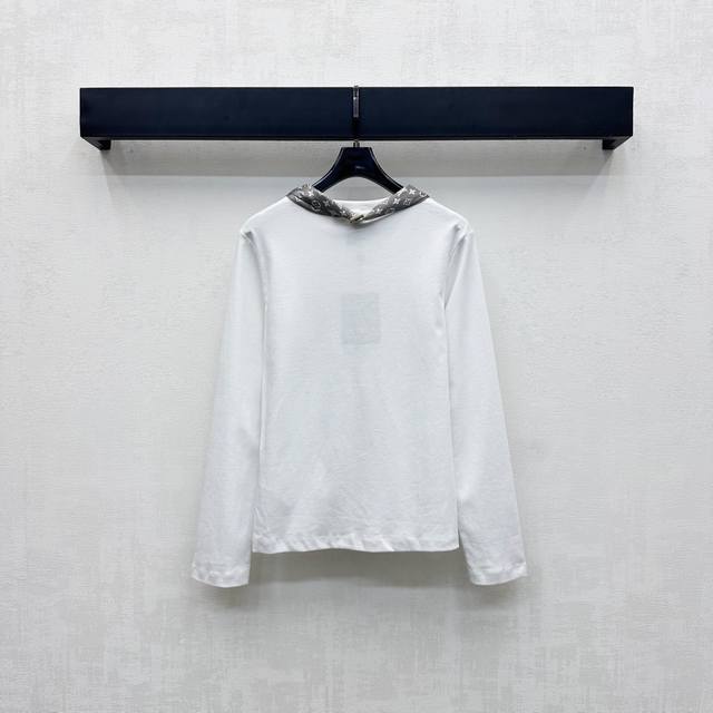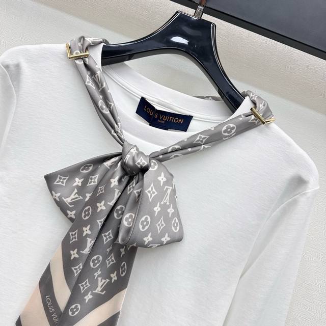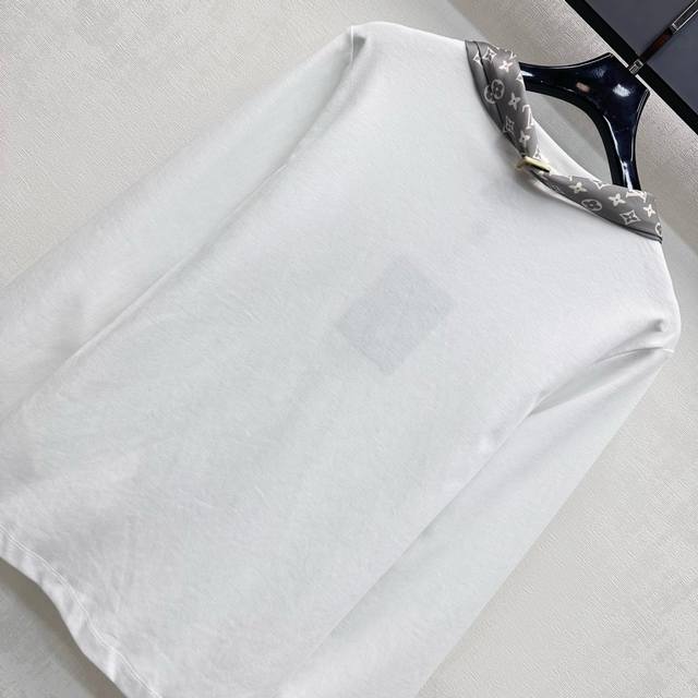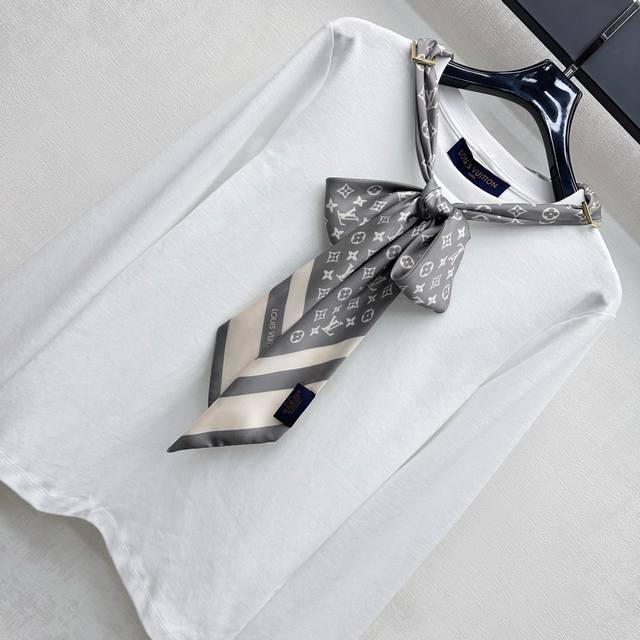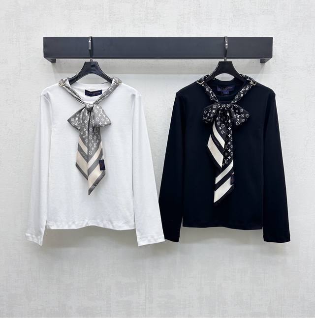 Louis Vuitto*2025 New Arrivals. Custom long-sleeved silk scarf made of imported YB twill cotton. Breathable and comfortable. Perforated silk scarf along the collar adds layered style. Can be loosened or tied for a more fashionable look. The iconic four-leaf clover logo highlights the brand's tone. Fabric and accessories are developed. Round neck long-sleeved top, tailored to be worn alone or layered. High-end version in two colors.