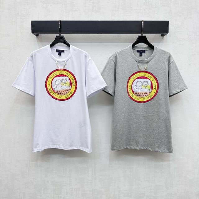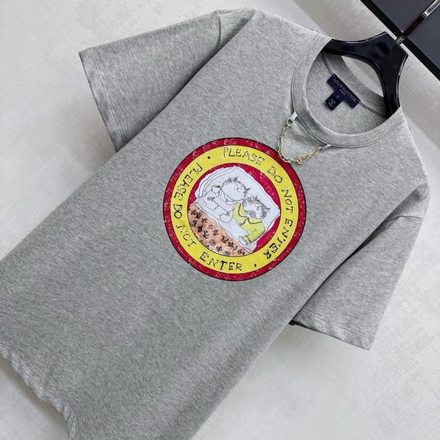 Louis Vuitto*2025 new arrivals. Round neck, custom chain print. YB imported twill cotton material, breathable and comfortable, with a rich texture. Made of heavyweight pure cotton. Drape for a slimming effect. The chest is printed with a vibrant color to create a rounded, three-dimensional silhouette. The interior features an illustration of a sleeping kitten, hand-painted with the iconic floral logo, and a lettered chain at the neckline, highlighting the brand's signature tone. Fabric and accessories are developed for a loose, short-sleeved T-shirt with a stylish and sophisticated fit, creating a personalized look. Wear it alone or as an inner layer.
