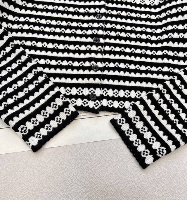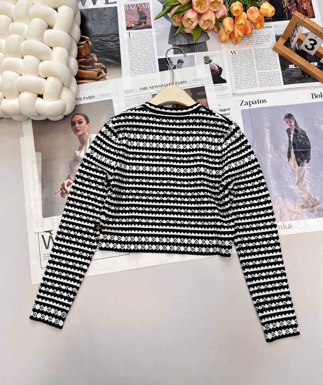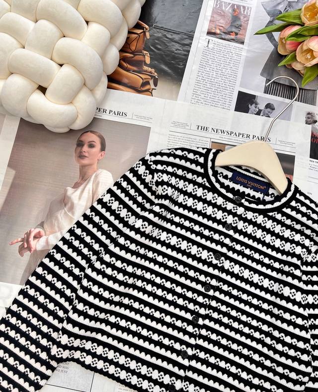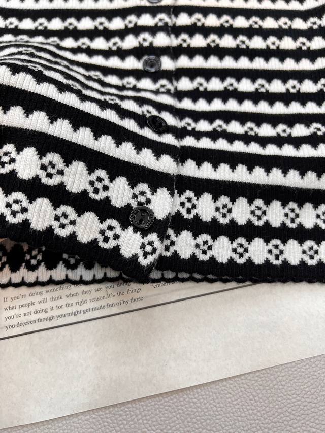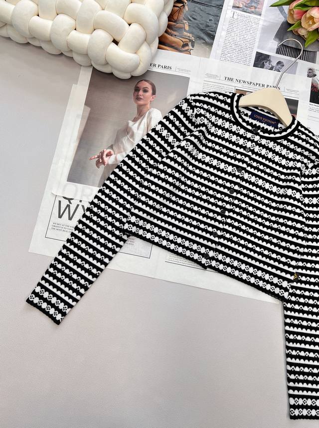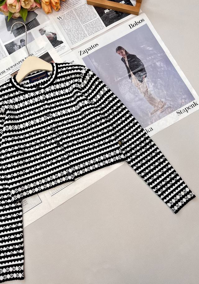 Louis Vuitton 2025 new crocheted knitted cardigan, custom-made with yarn weaving for a premium and comfortable look. Short, slim-fitting knitted cardigan with wavy lace trims on the sleeves and hem. Multi-texture stripes throughout highlight the brand's personality, giving it a sophisticated, inclusive, and slimming design. The ribbed neckline allows a simple style to be worn with refinement and individuality, showcasing a relaxed tone. The latest four-leaf clover logo is customized at the waist, distinguishing between different market versions. Lightly luxurious and fashionable, it can be worn alone or layered, making it the top choice for all-season fashion. Available in three sizes: