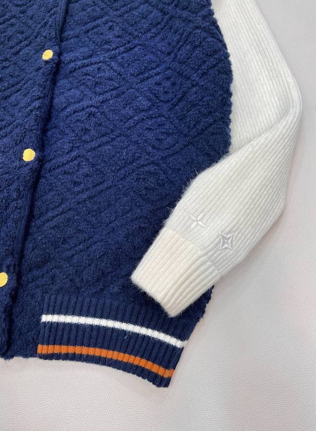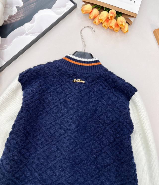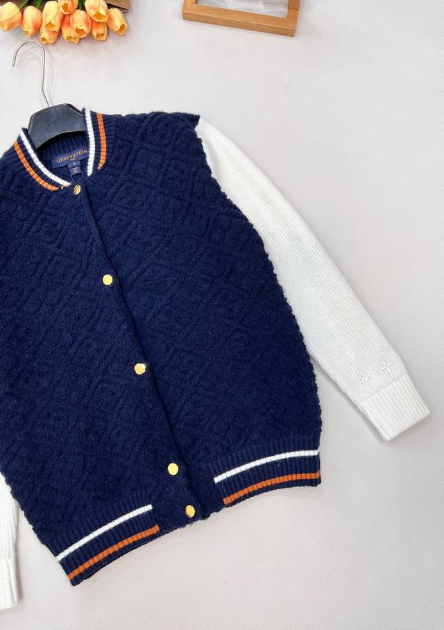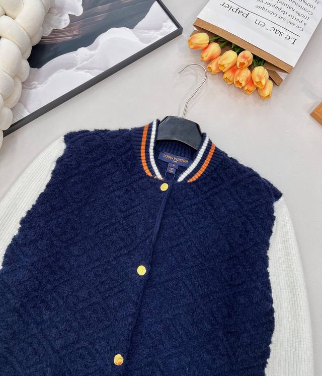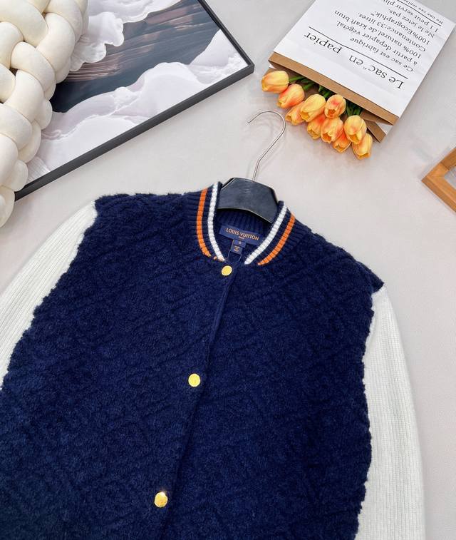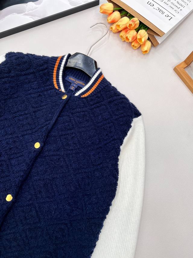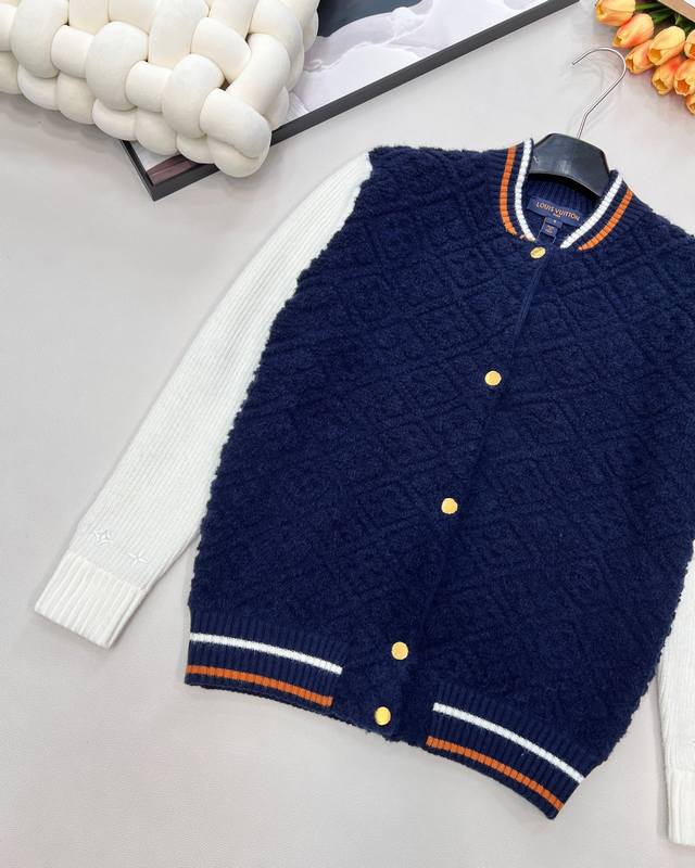 Louis Vuitton 2025 New Jacquard Knit Zipper Baseball Color-Block Jacket, Ski Collection# Crafted with custom Yb wool yarn, jacquard treatment for a three-dimensional textured look. Baseball jacket silhouette, snap-button closure, elastic ribbed collar and hem for a tapered finish. The overall style is sophisticated yet casual. The torso is adorned with embossed four-leaf clover jacquard details, while the sleeves feature contrasting colors for a fashionable touch. The embossed four-leaf clover texture on the cuffs matches the logo design on the back collar. The stretch fabric offers greater comfort and complements the brand's chic style. Custom fabric and accessories, complete with tags. Bulk orders available. Sizes: S, M, L, DDD. Code: L, DDD.