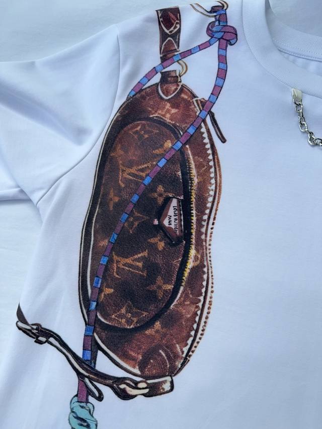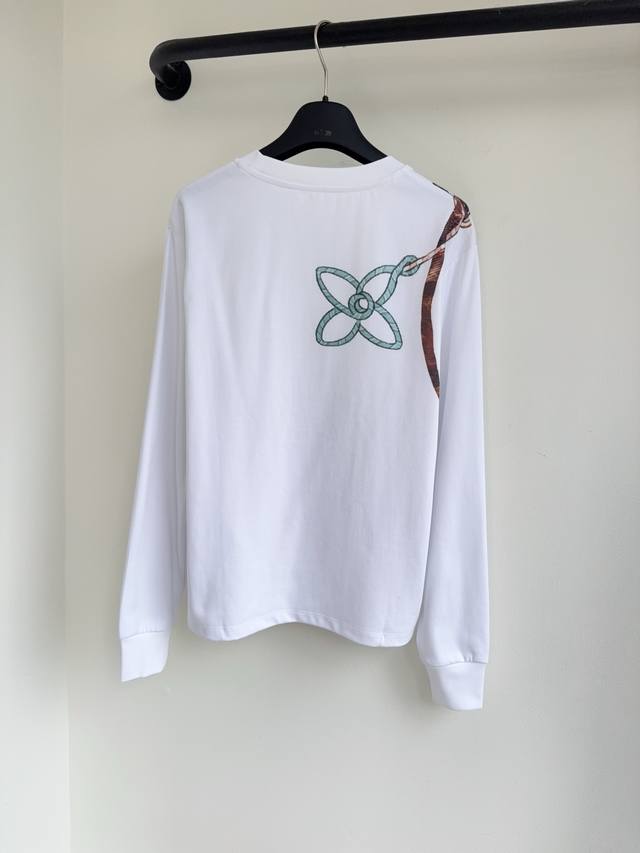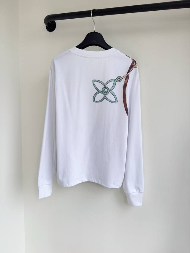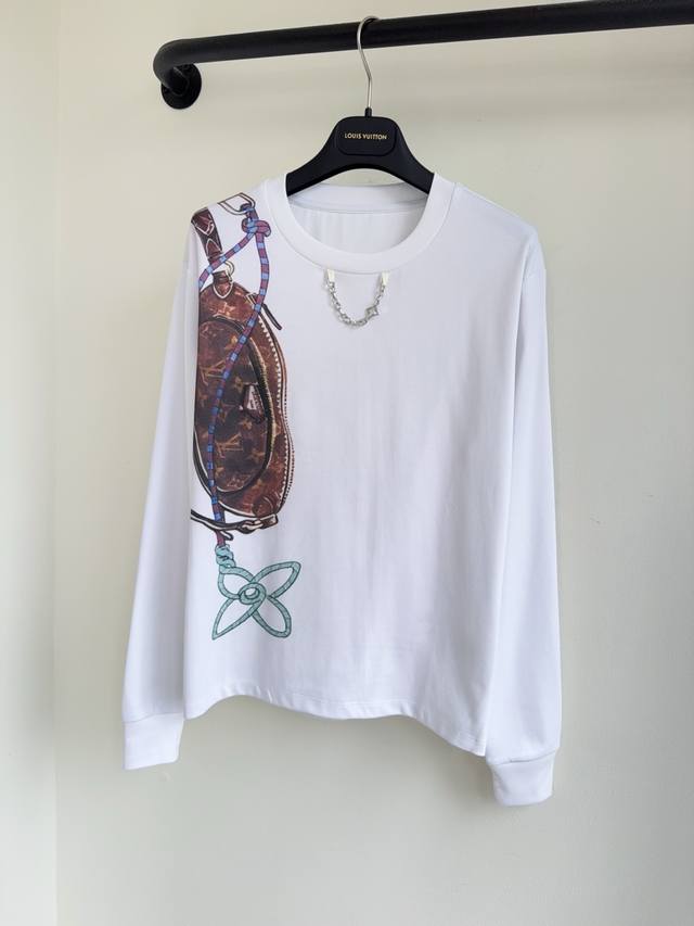 Louis Vuitton Fall/Winter 2025 New Printed Pattern Metal Chain Sweatshirt is now available. This sweatshirt features a playful print inspired by the Travels With Grace Coddington collaboration. The hand-painted Louis Vuitton logo border creates a vintage travel stamp pattern. The soft cotton double rib knit and ribbed hem provide a comfortable feel, while the chain at the neckline adds another brand element. SML