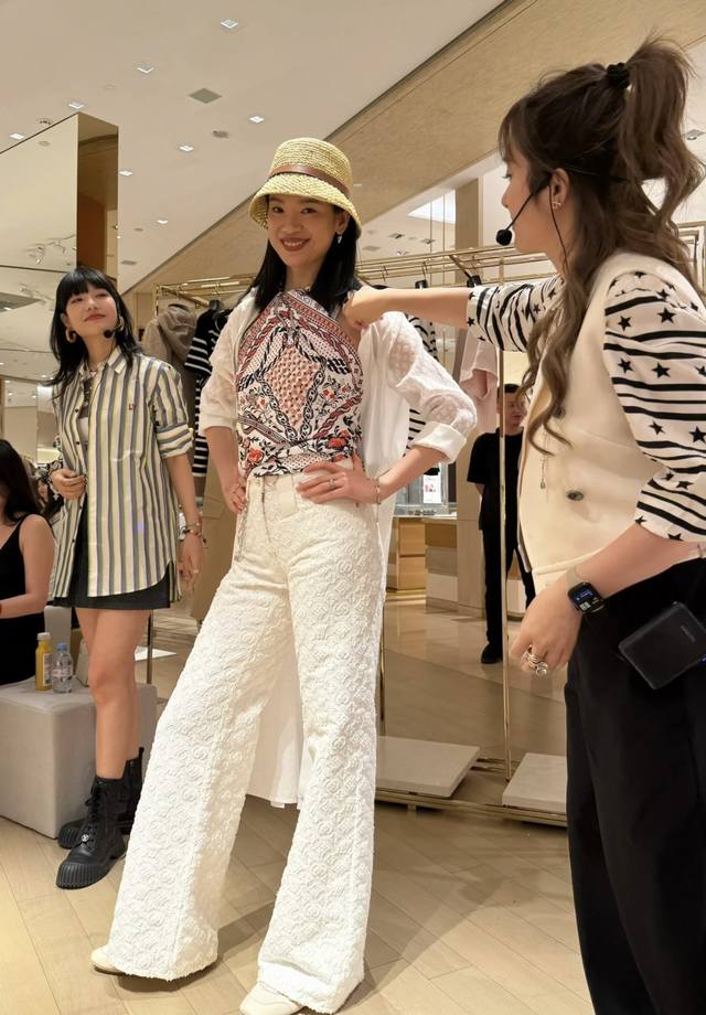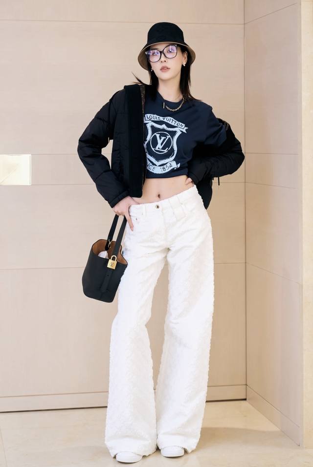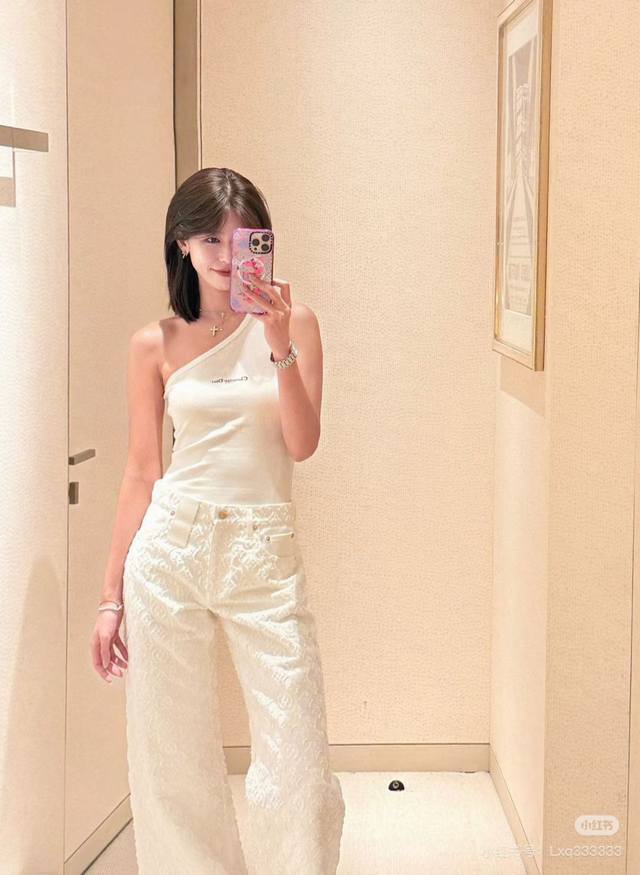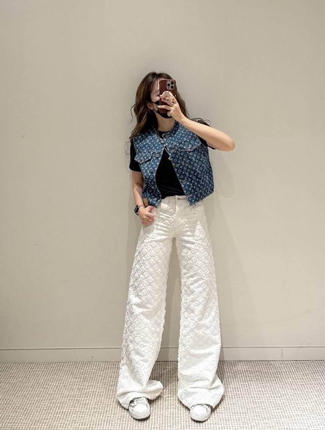 Louis Vuitton ( LV) New Arrival! High-quality custom monogram jacquard fabric, original logo lettering, distressed hardware, high-waisted, slimming, stylish, versatile wide-leg jeans! White, Size M: Waist 72cm, Length 102cm.